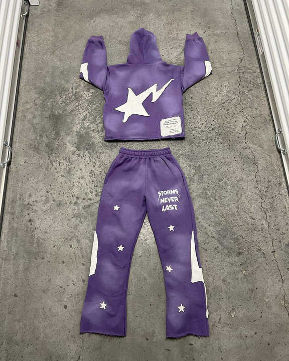 ชุดเซ็ตเสื้อฮู้ดดี้และกางเกงวอร์มทรงขาบานสำหรับผู้ชาย ตกแต่งด้วยงานปักแบบแอพพลิเค่ ล้างสีแบบแอซิดวอช ผ้าหนานุ่ม ซิปหน้า สไตล์ดิสเทรส