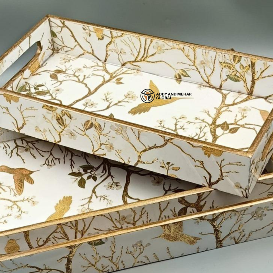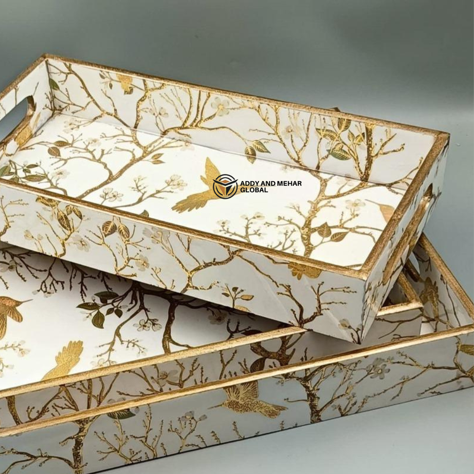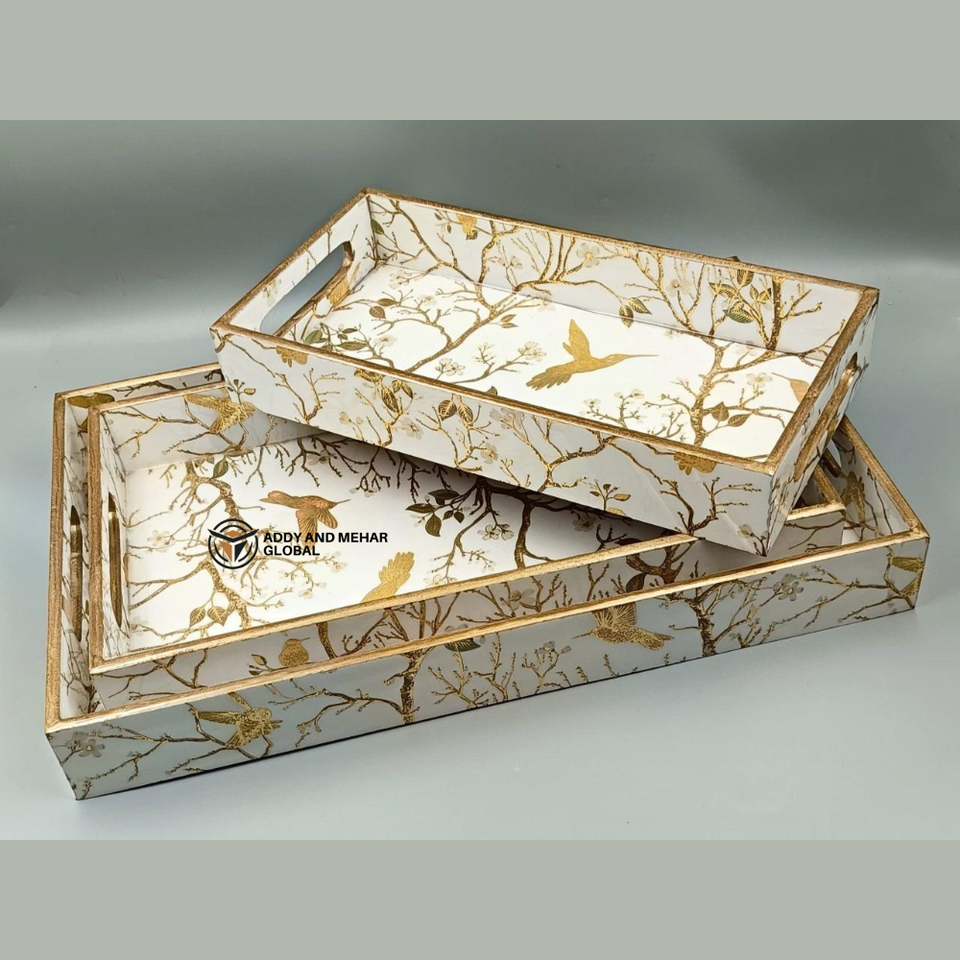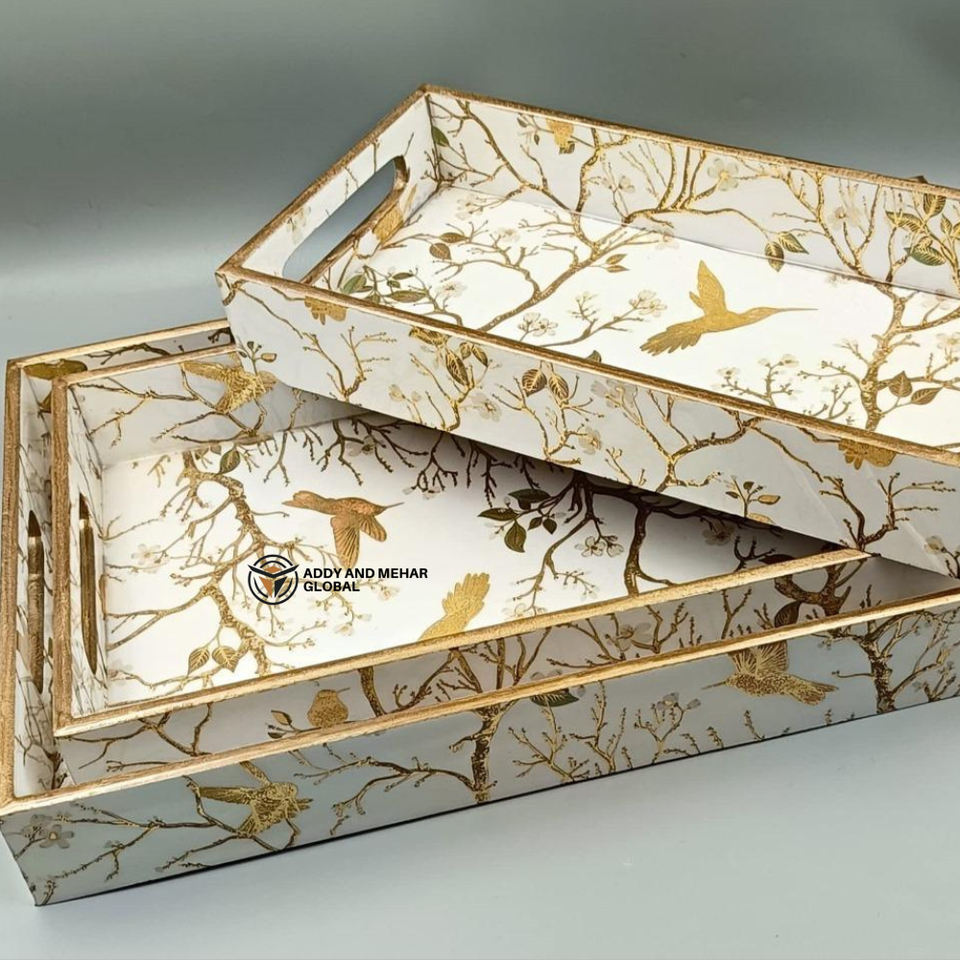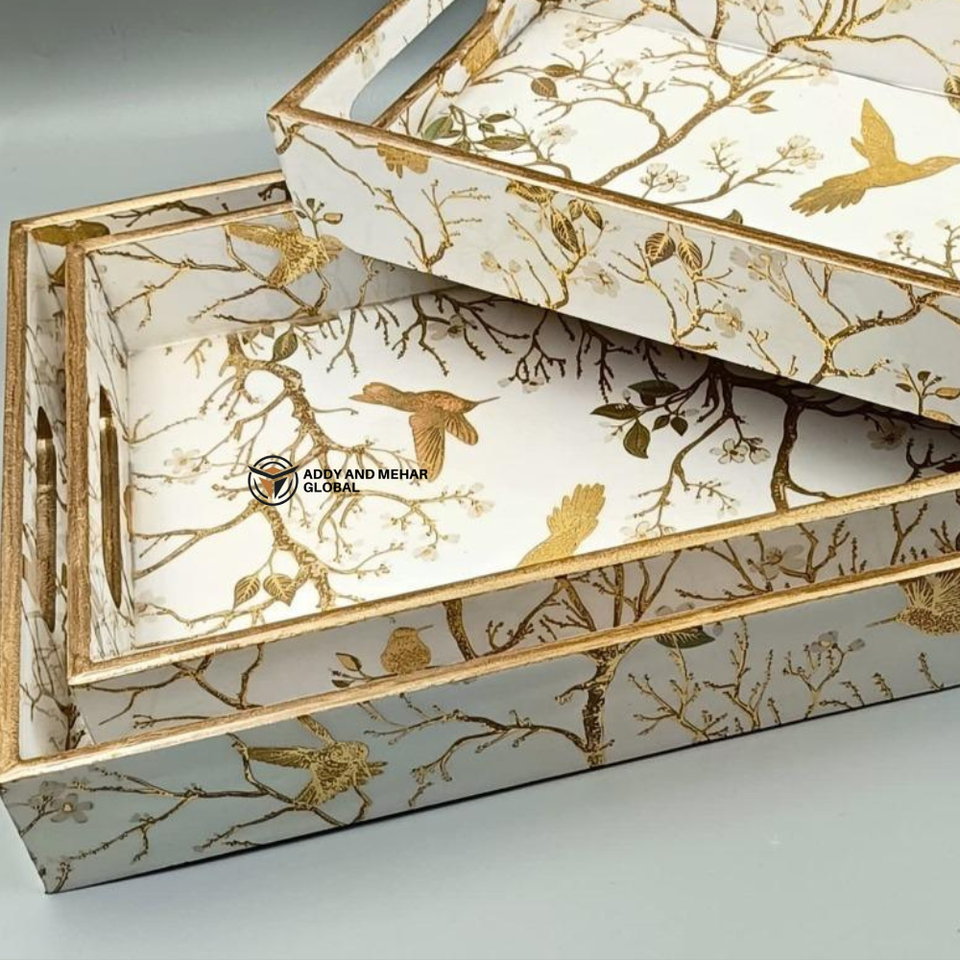 ชุดถาดเคลือบ MDF งานฝีมือแบบกำหนดเอง ถาดไม้ซ้อนกันได้แบบยั่งยืนพร้อมลายพิมพ์พฤกษศาสตร์ ถาดตกแต่งสำหรับบ้านแบบขายส่ง