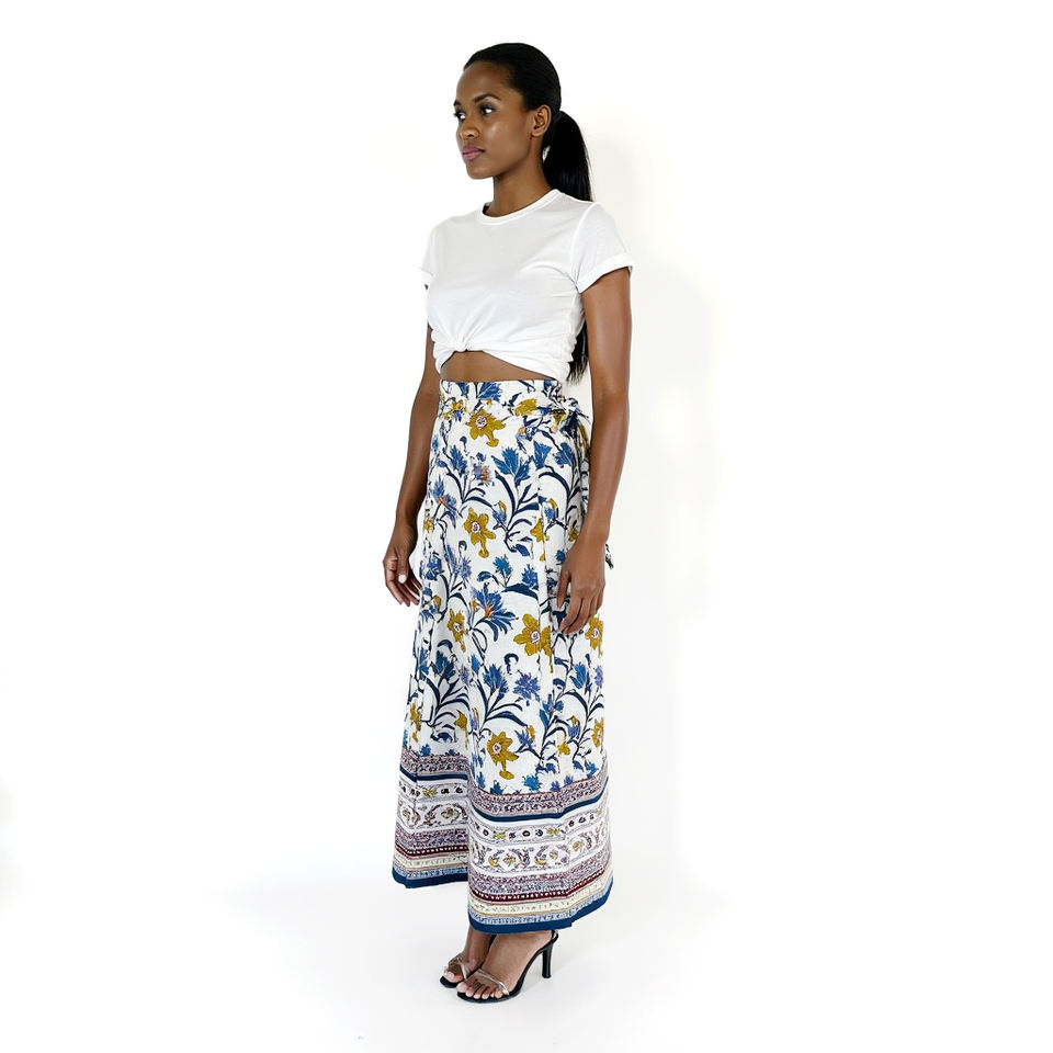 กระโปรงยิปซีออกแบบตามสั่งสำหรับผู้หญิงผ้าระบายอากาศน้ำหนักเบามีลายดอกไม้สีฟ้าสดใสสีเหลืองพิมพ์ลายตลาดของเรา