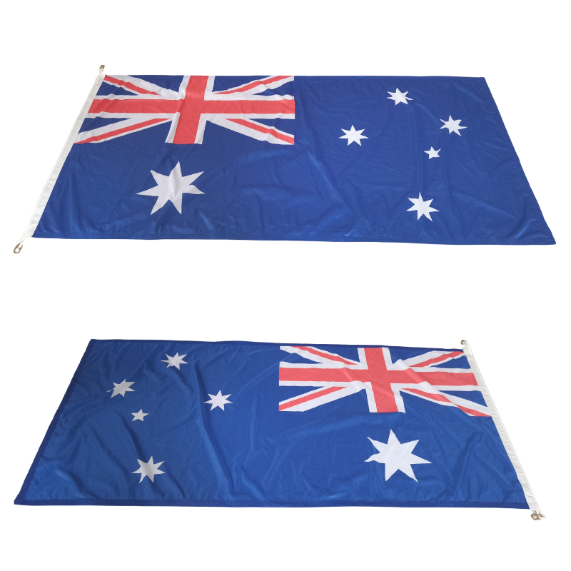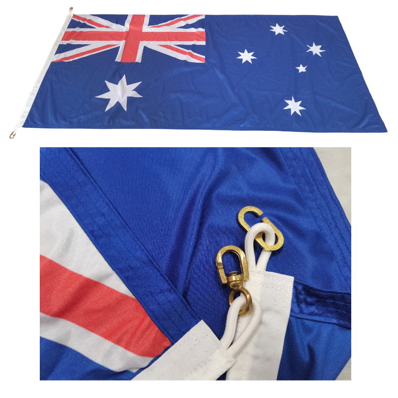 ธงชาติออสเตรเลียแบบกำหนดเอง เป็นมิตรกับสิ่งแวดล้อม ทนทาน แห้งเร็ว ขนาด 3 ฟุต x 6 ฟุต (1800 มม. x 900 มม.) พิมพ์ดิจิทัล ผ้าโพลีเอสเตอร์ถักเย็บ
