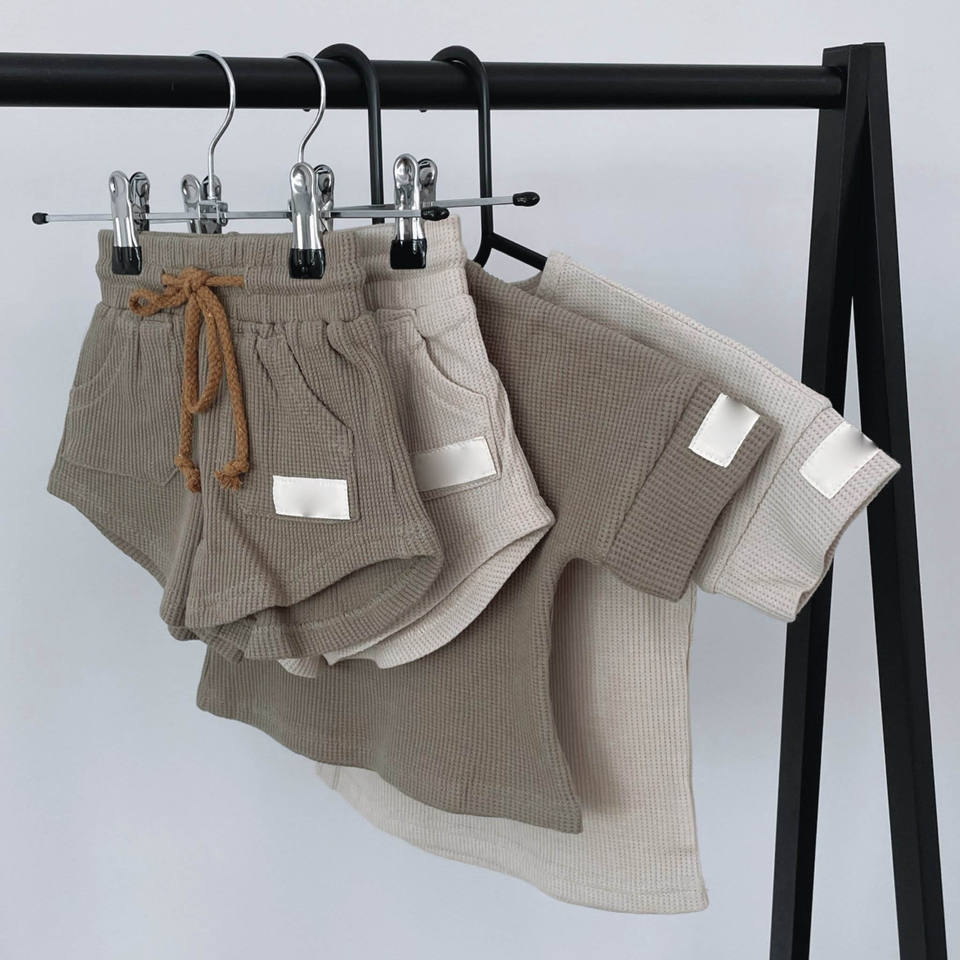 ชุดเสื้อผ้าเด็กทารกชายหญิงแบบสบายๆ แขนสั้น ผ้าวาฟเฟิล สำหรับฤดูร้อน ชุดเสื้อผ้าเด็กแบบยูนิเซ็กซ์ พร้อมป้ายยี่ห้อ