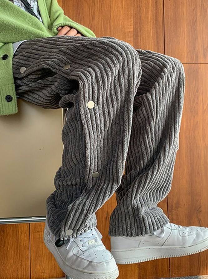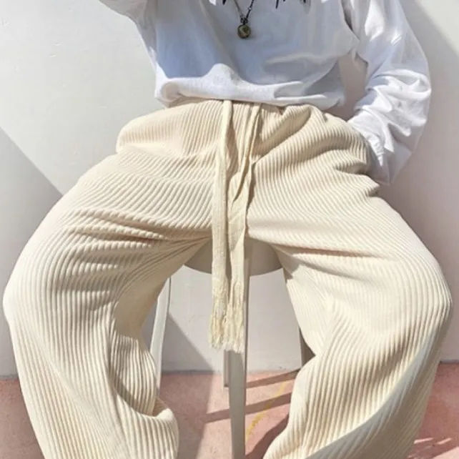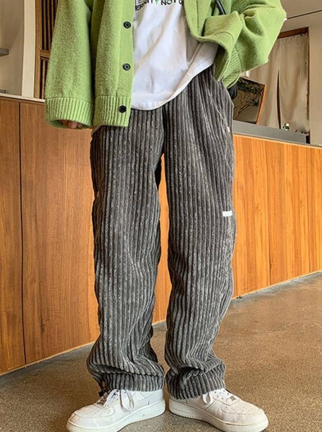 กางเกงผ้าลูกฟูกแบบหลวมสำหรับผู้ชายกางเกงขาบานแบบลำลองกางเกงเอวสูงลายทางโลโก้ OEM ออกแบบได้ตามต้องการ