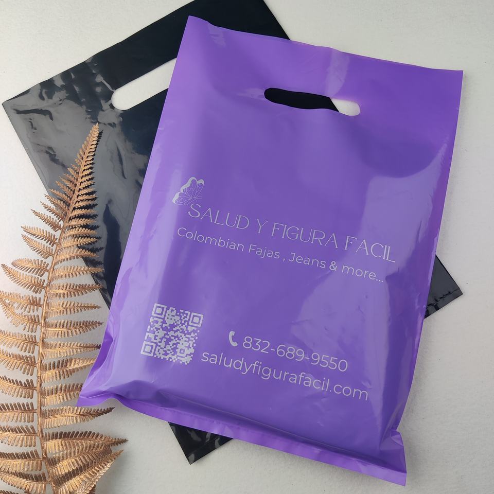 ถุงช้อปปิ้งพลาสติกกันน้ำมีโลโก้กระเป๋าช้อปปิ้งสำหรับขายปลีกพิมพ์ลายหรูหราถุงช้อปปิ้งพลาสติกไดคัทพร้อมที่จับ
