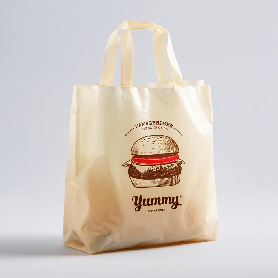 ถุงช้อปปิ้งทำจากพลาสติกกันน้ำมีโลโก้กระเป๋าช้อปปิ้งพลาสติกแบบห่วงนิ่มพิมพ์ลายหรูหราพร้อมที่จับ