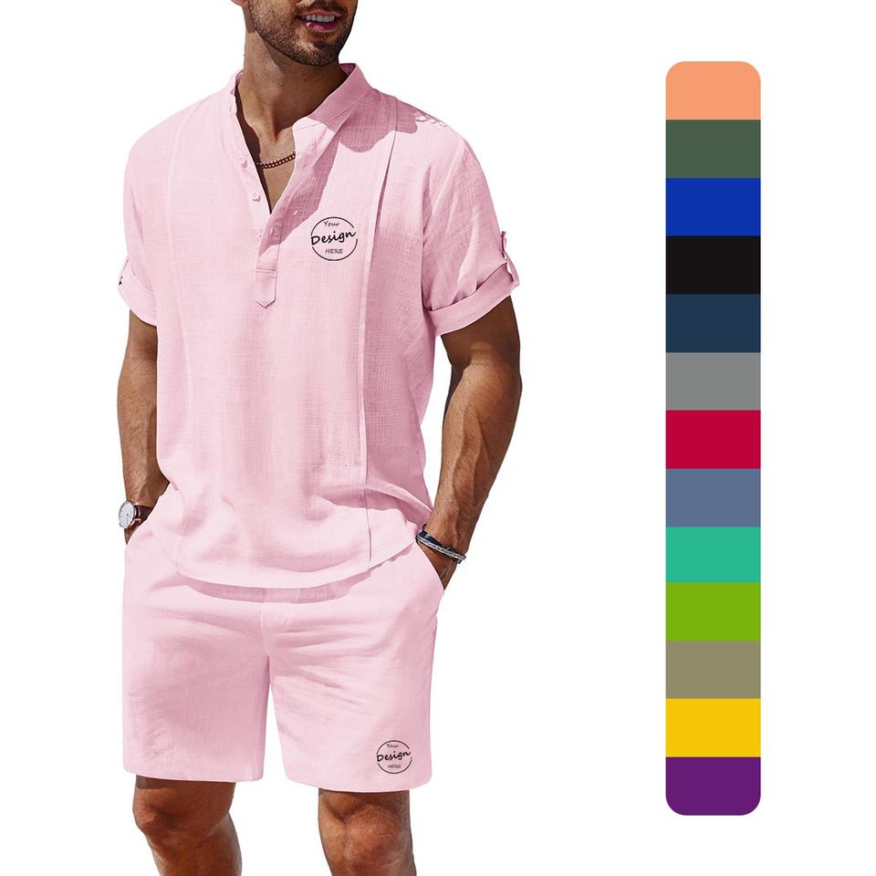ชุดเสื้อผ้าลินินแบบ100สำหรับผู้ชายเสื้อคอปกแบบผ่าครึ่งมีกระเป๋าข้างเอวยางยืดมีกระเป๋าข้างและกางเกง