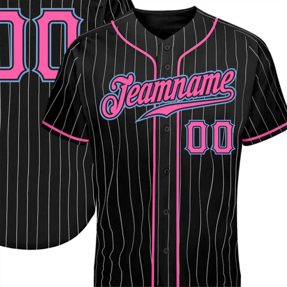 เสื้อเบสบอลสั่งทำเสื้อ100% โพลีเอสเตอร์แห้งเร็วสีดำลายทางสีชมพูสีน้ำเงินชุดทีมมีกระดุมชื่อเฉพาะตัว