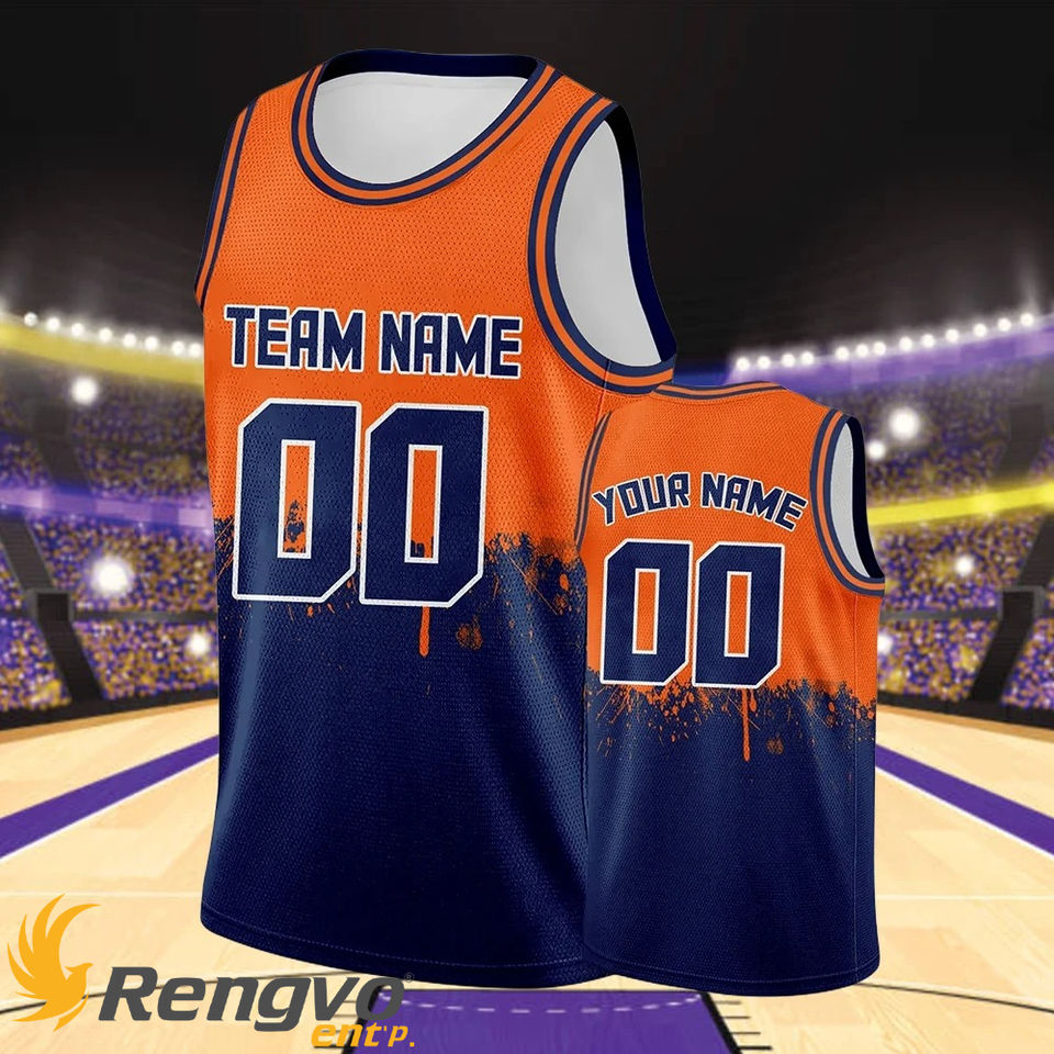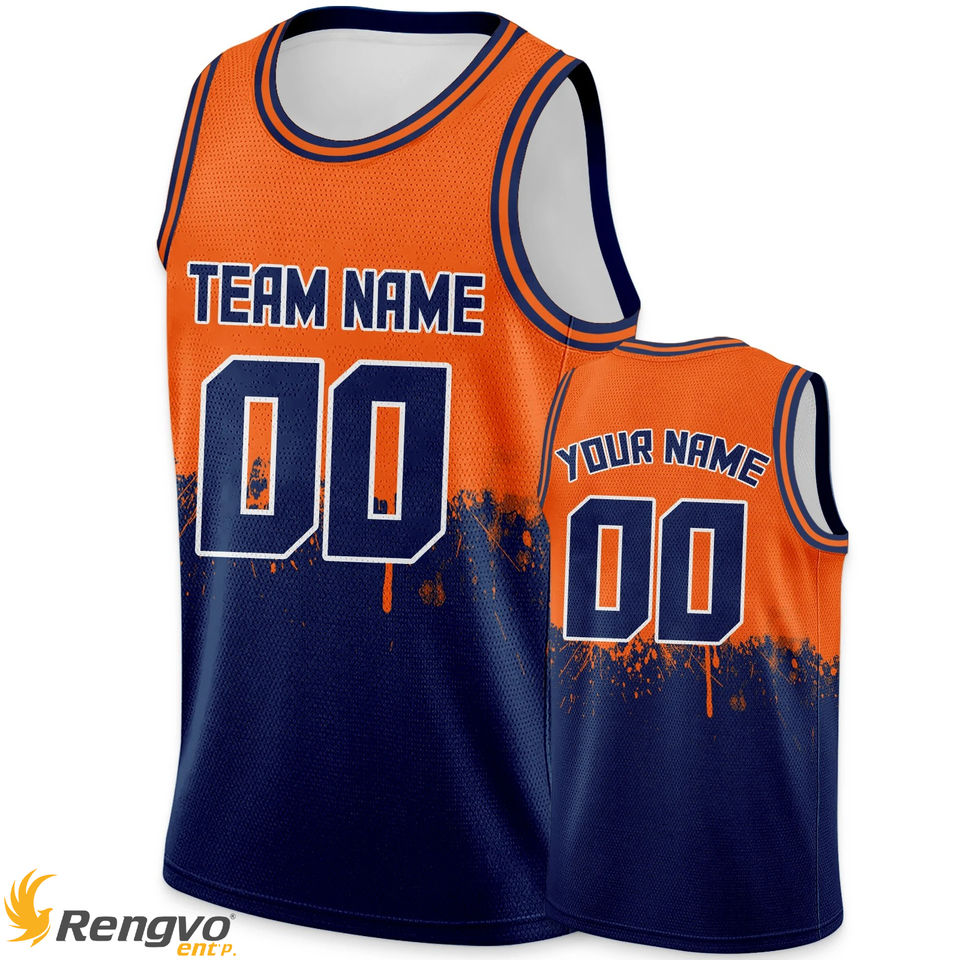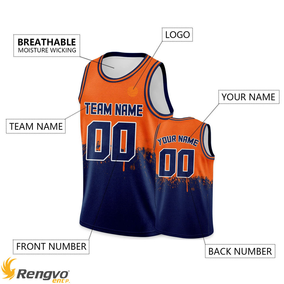 ชุดกีฬาเสื้อบาสเก็ตบอลสำหรับผู้ชายและผู้หญิงชุดกีฬาเสื้อบาสเก็ตบอลพิมพ์ลายตามหมายเลขทีมสีส้มสีกรมท่า