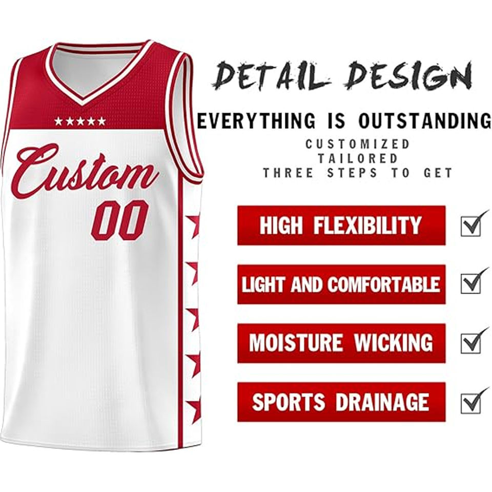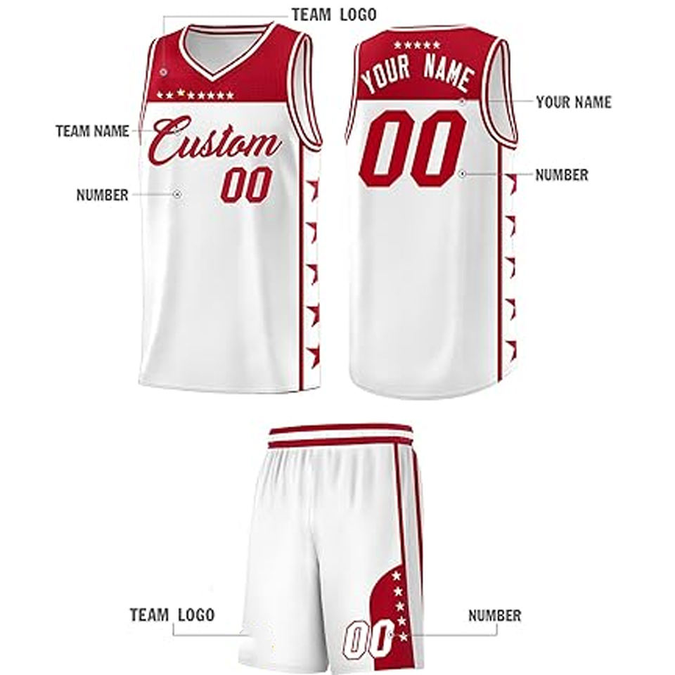 ชุดบาสเก็ตบอลแบบกำหนดเอง เสื้อและกางเกงขาสั้นแบบกลับด้านได้ ผลิตจากโพลีเอสเตอร์ 100% คอวี ตัดเย็บตามสั่ง พร้อมโลโก้ ชื่อ และหมายเลข สำหรับทีมวิทยาลัยหรือสโมสร