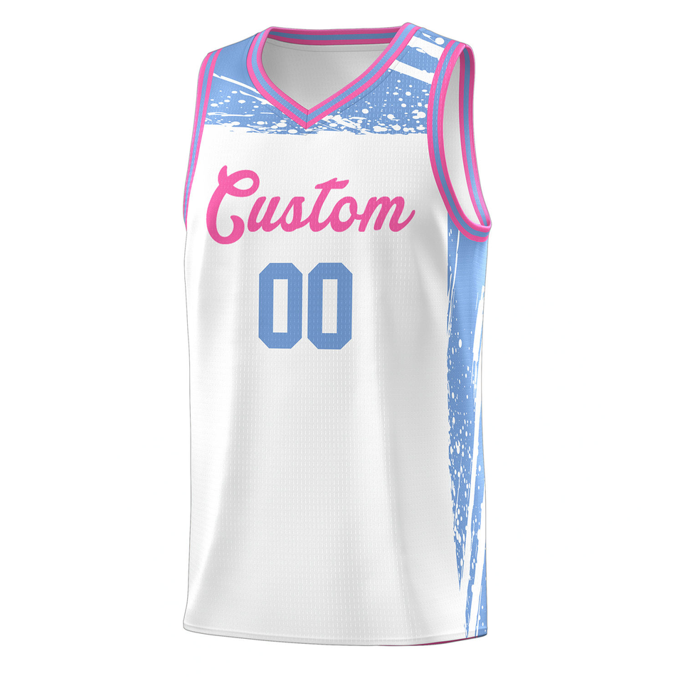 ชุดบาสเก็ตบอลชุดทีมกีฬาสีขาวและสีฟ้าอ่อนเสื้อเจอร์ซีย์ส่วนตัวและกางเกงขาสั้นตาข่ายน้ำหนักเบาออกแบบได้ตามต้องการ