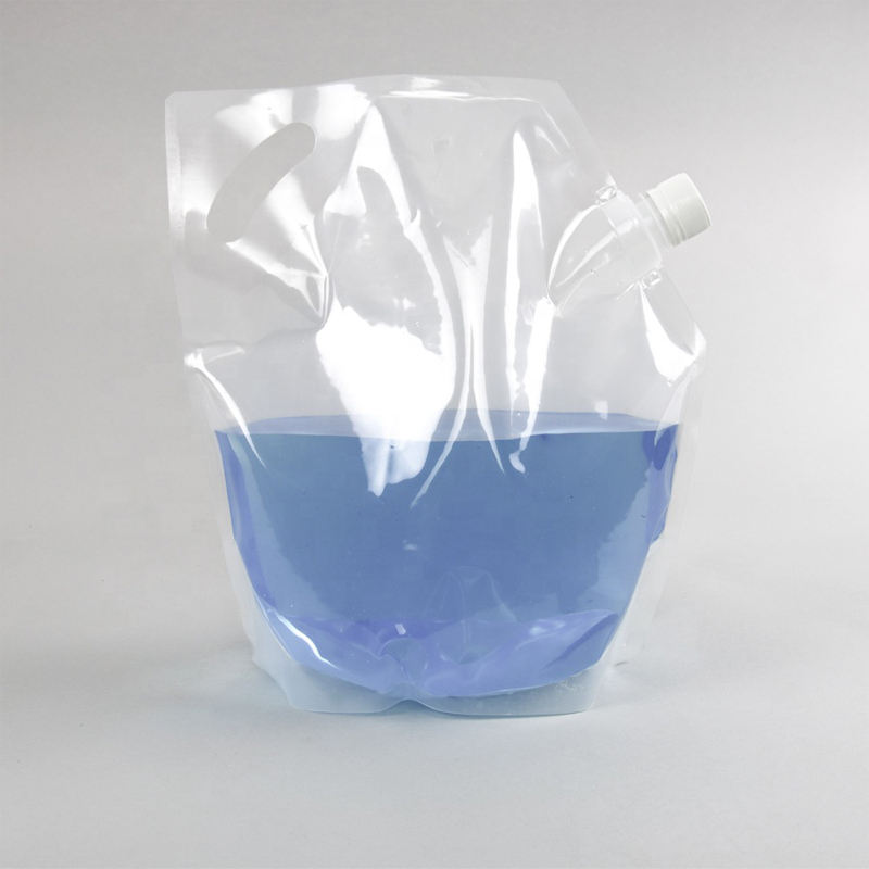 ถุงใส่น้ำแบบพกพา มีหูหิ้วพลาสติกพับได้ สำหรับบรรจุภัณฑ์เครื่องดื่มเบียร์แบบกำหนดเอง เกรดอาหาร พร้อมจุกใสสำหรับของเหลว เช่น น้ำยาซักผ้า