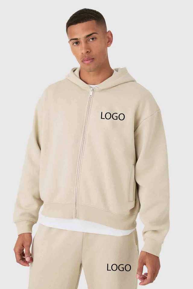 ชุดวอร์มผ้าฟลีซสองชิ้นสำหรับผู้ชายชุดวอร์มผ้าฟลีซแบบใส่เล่นมีซิปสีเบจออกแบบได้ตามต้องการ