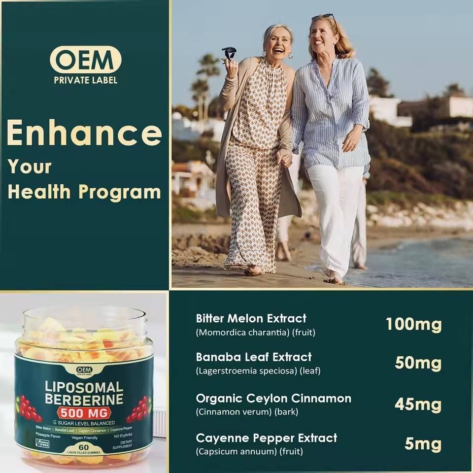 อาหารเสริมเบอร์เบอรีนแบบกำหนดเอง 500 มก. เบอร์เบอรีนแบบลิโปโซมในรูปแบบเยลลี่ ผสมอบเชยซีลอน มะระขี้นกแบบวีแกน เพื่อการเผาผลาญที่สมดุล