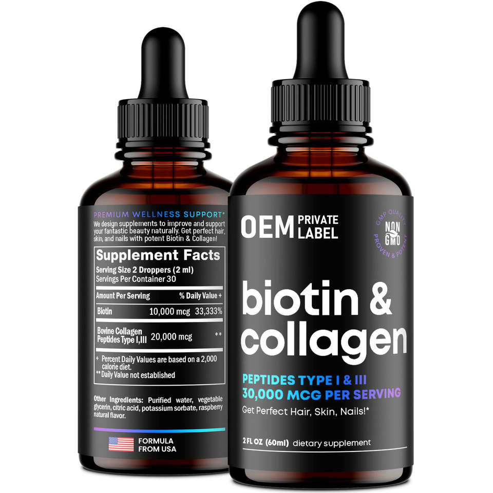 หยดบำรุงเส้นผมสูตรธรรมชาติผสมไบโอติน คอลลาเจน และเคราติน สำหรับผู้ใหญ่ ช่วยบำรุงผิวและเล็บ พร้อมวิตามินและสารช่วยจัดการพลังงาน