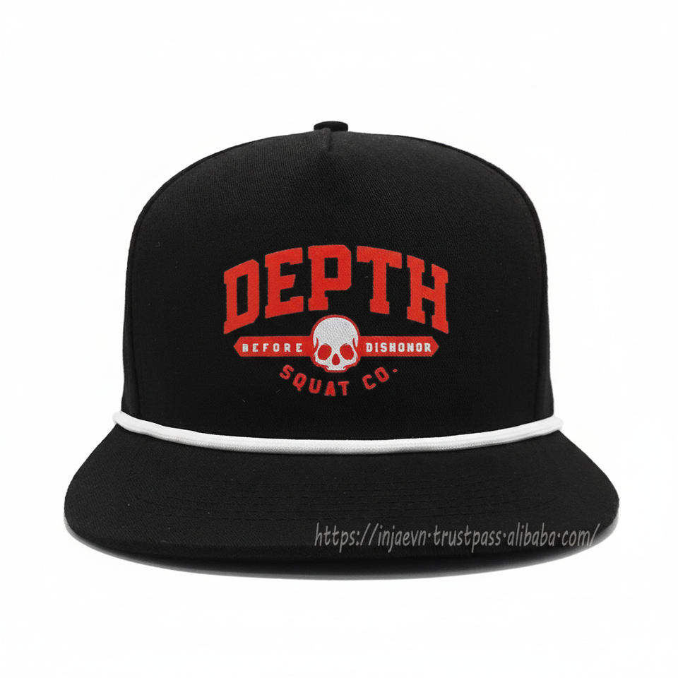 หมวกสแนปแบ็ก5แผงสีดำแบบกำหนดเองพร้อมโลโก้พิมพ์ถ่ายเทความร้อนและรายละเอียดเชือกด้านหน้าหมวกสตรีทแวร์