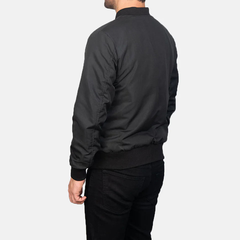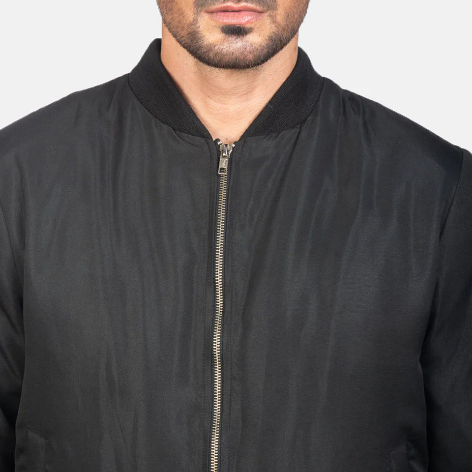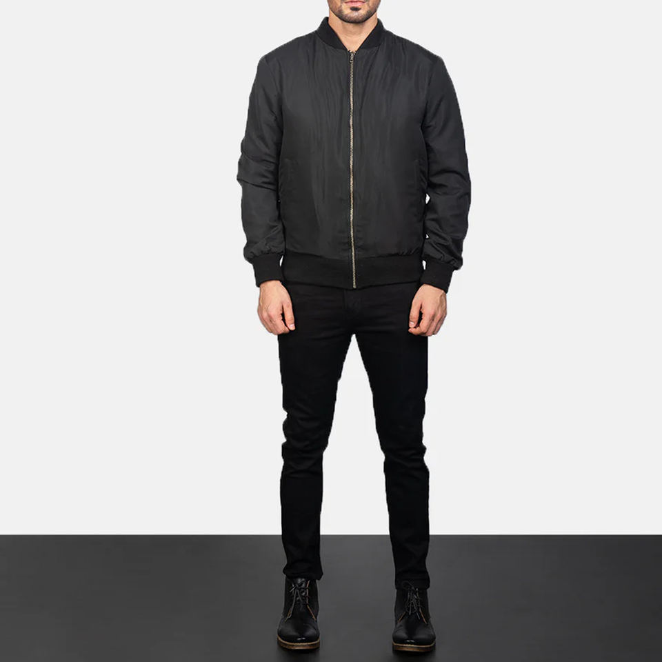 แจ็คเก็ตบอมเบอร์ผ้าซาตินโพลีเอสเตอร์สีดำแบบกำหนดเองสำหรับฤดูหนาว พร้อมขอบยางยืด คอวาร์ซิตี้แบบตั้ง มีกระเป๋าด้านใน กันลม เป็นมิตรกับสิ่งแวดล้อม
