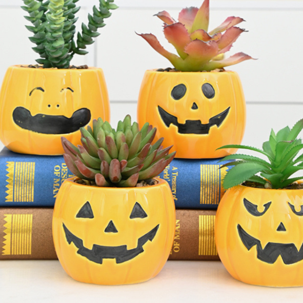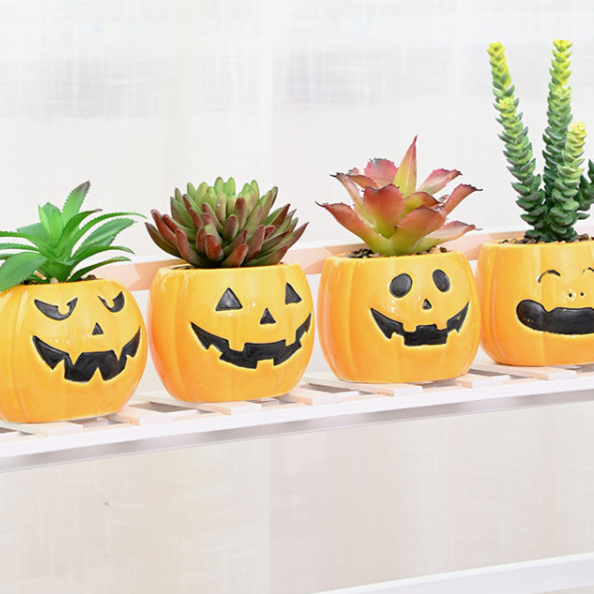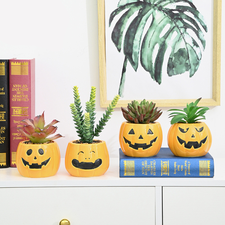 กระถางดอกไม้เซรามิกน่ารักลายผีฟักทองสีดำกระถางต้นไม้สำหรับวันฮาโลวีนขนาดเล็กงานตามสั่ง