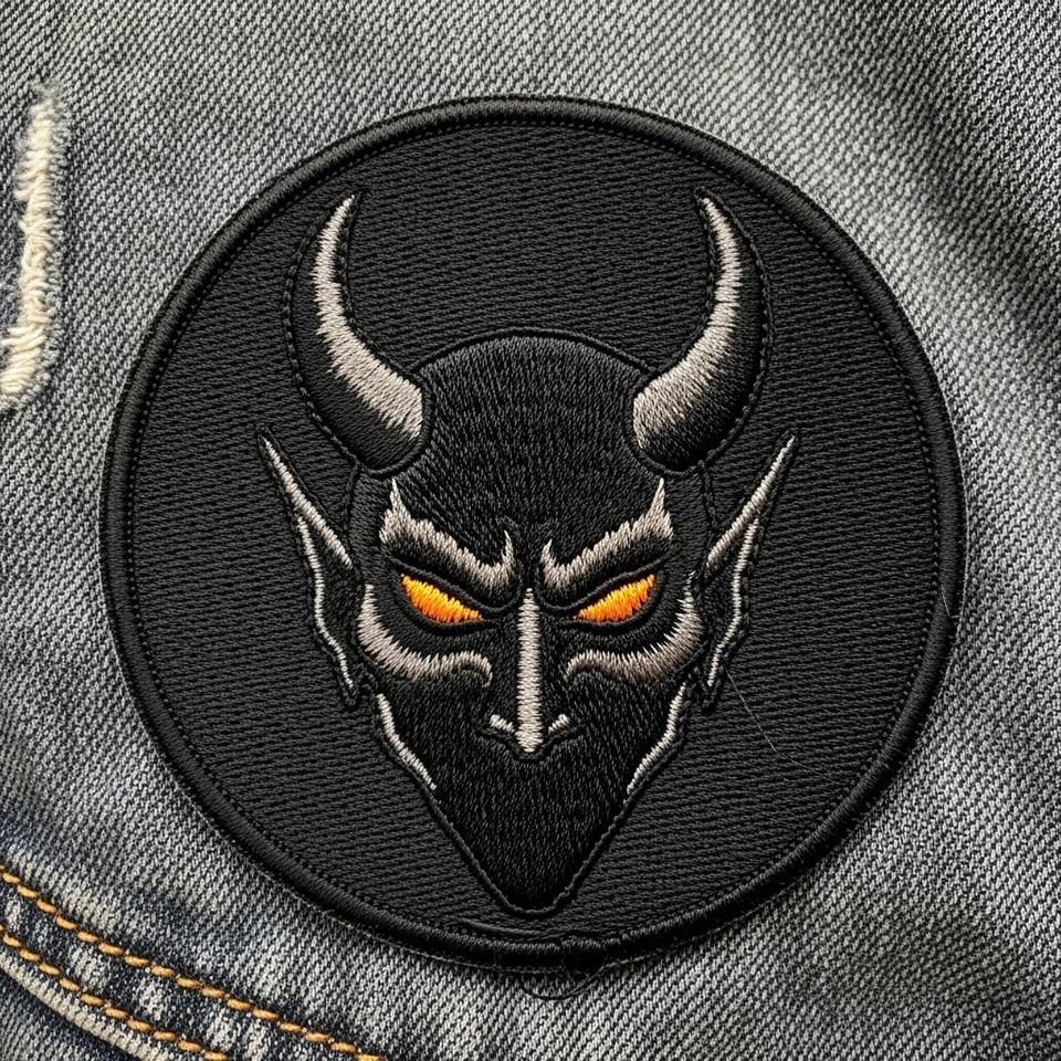 แพทช์รูปเขาปีศาจสีดำแบบกำหนดเอง ปักด้วยเครื่องจักร รูปทรงวงกลม ตราสัญลักษณ์พังก์ กอธิค หัวปีศาจ สำหรับติดเสื้อแจ็คเก็ตและเสื้อผ้า