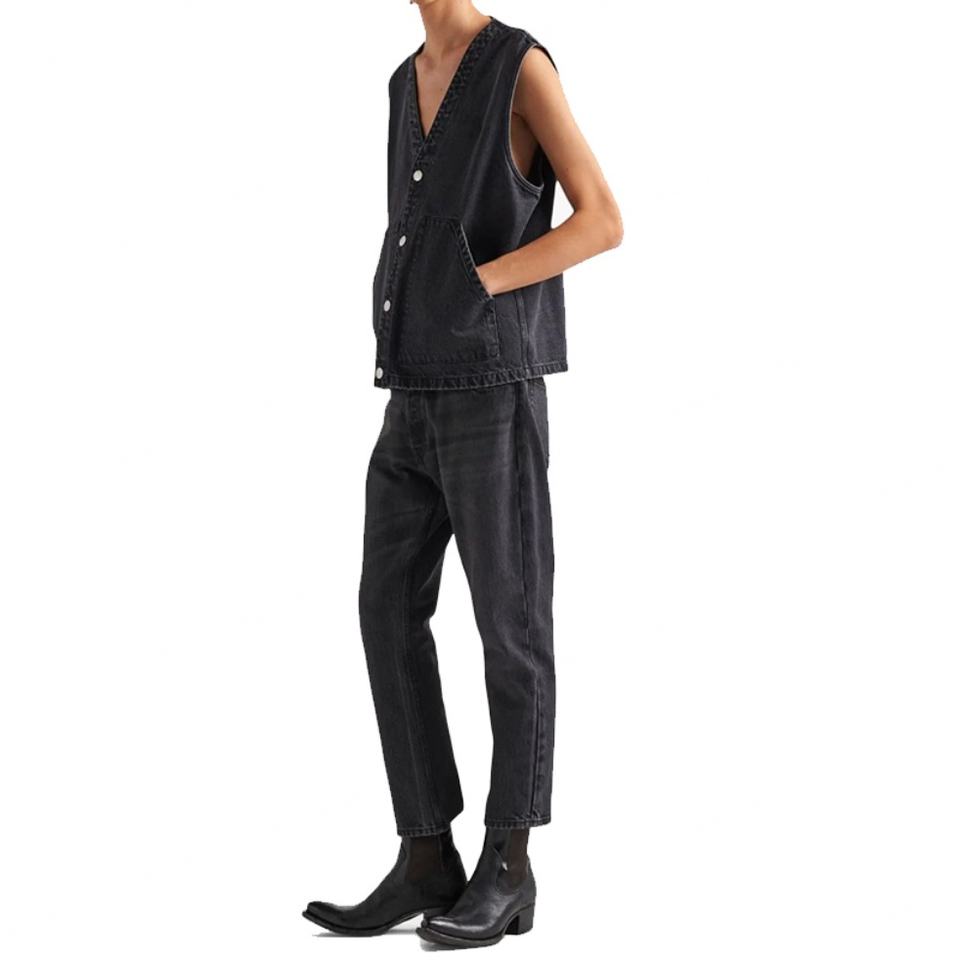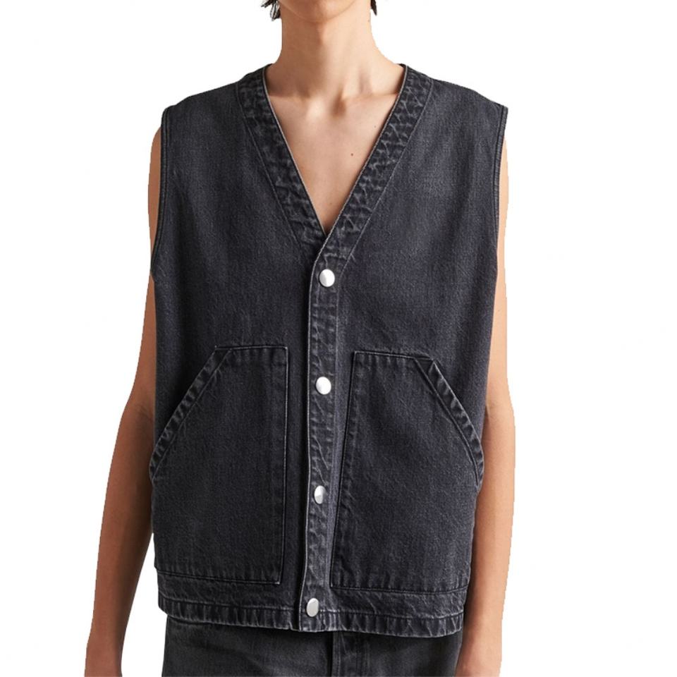 เสื้อกั๊กยีนส์สีดำแบบซีดจางทรงโอเวอร์ไซส์ คอวี แขนกุด ติดกระดุม สำหรับผู้ชาย