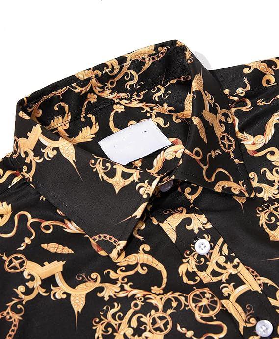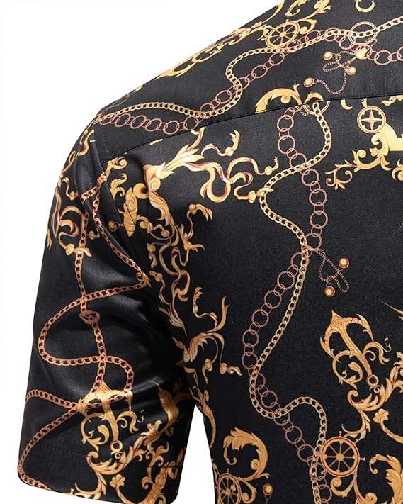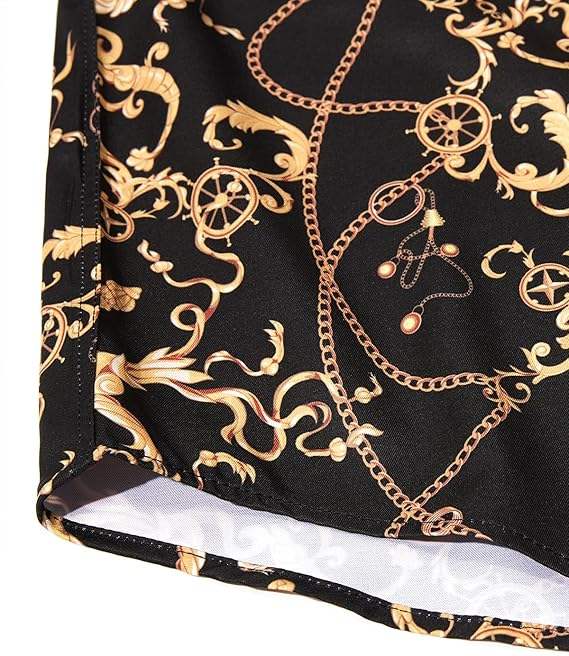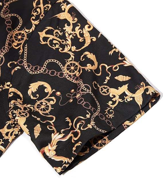ชุดเสื้อเชิ้ตและกางเกงขาสั้นผู้ชายสไตล์บาโรกสีดำทองแบบสั่งทำพิเศษ – ชุดฤดูร้อนพิมพ์ลายโซ่หรูหรา ติดกระดุม ผู้ผลิตชุดไซส์ใหญ่