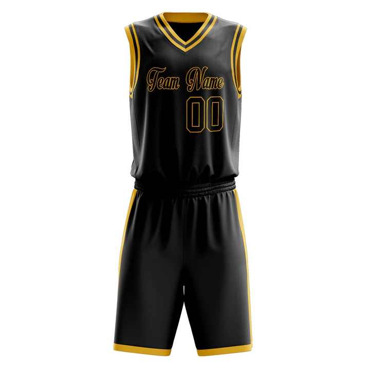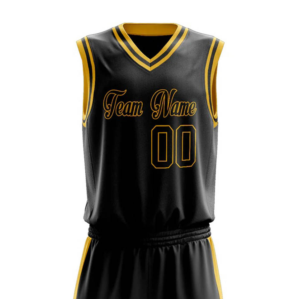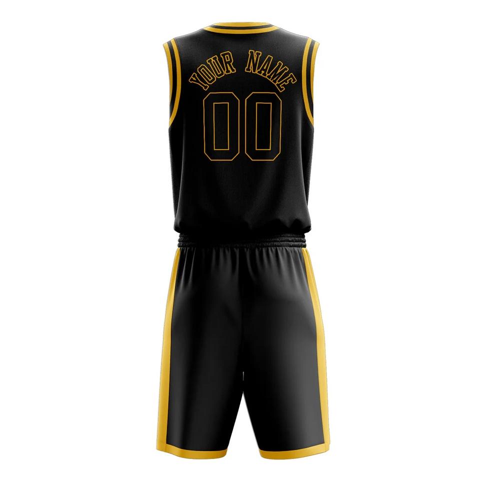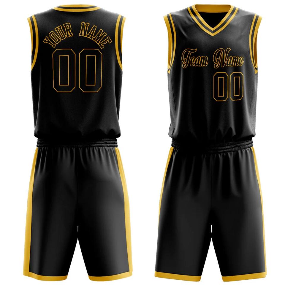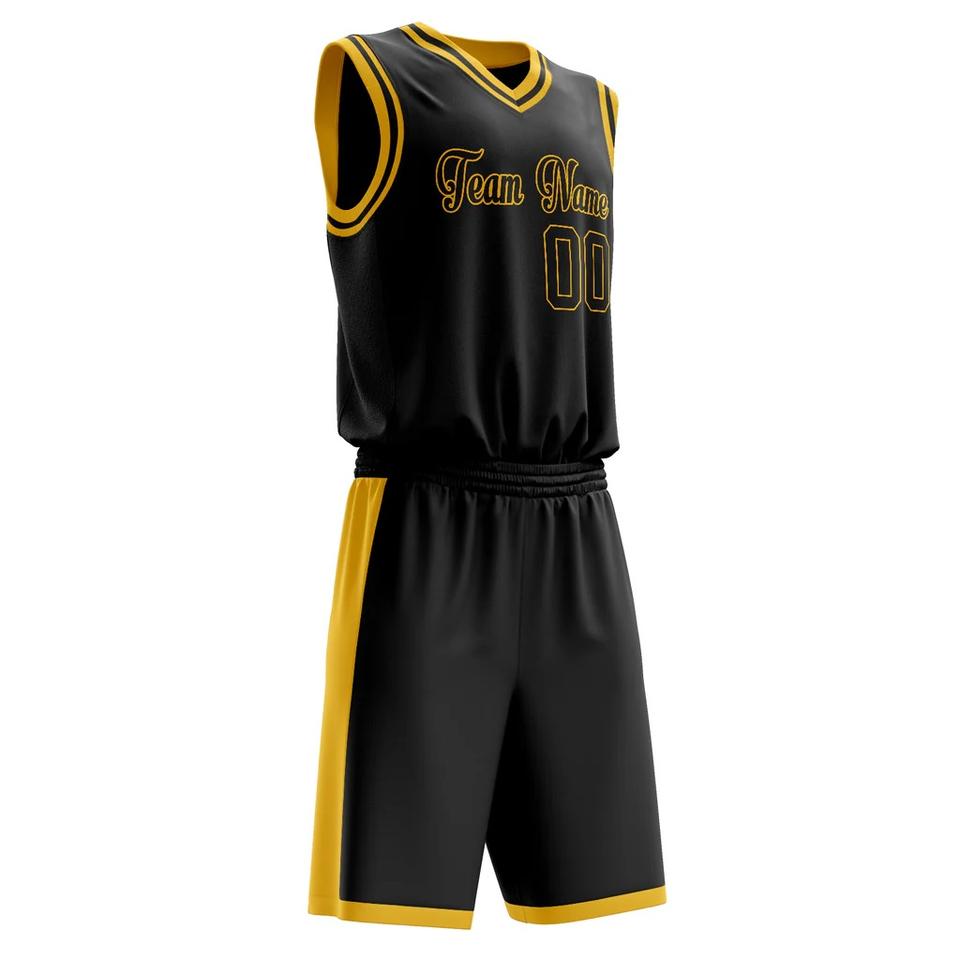 ชุดยูนิฟอร์มบาสเก็ตบอลสีดำทองแบบกำหนดเองสำหรับผู้ชาย โพลีเอสเตอร์ 100% แห้งเร็ว ต้านเชื้อแบคทีเรีย ไซส์ใหญ่ ระบายเหงื่อได้ดี พิมพ์ลายทีม