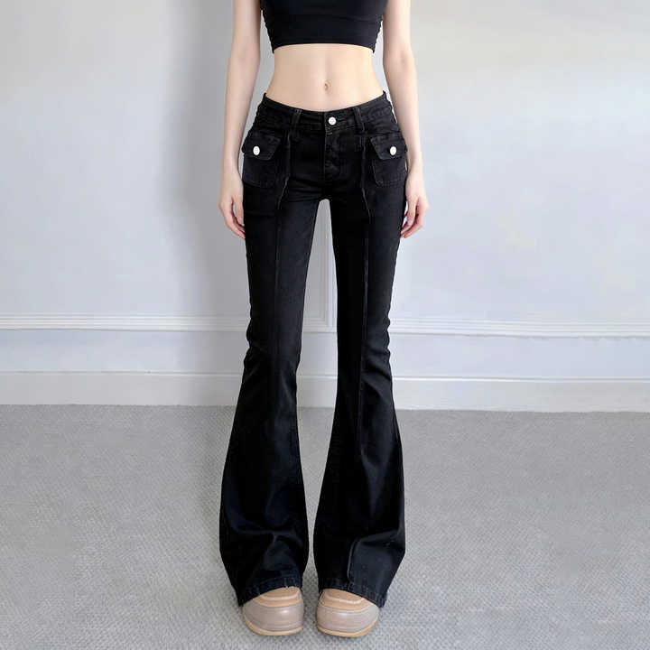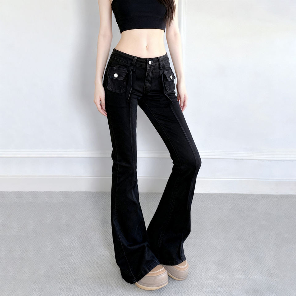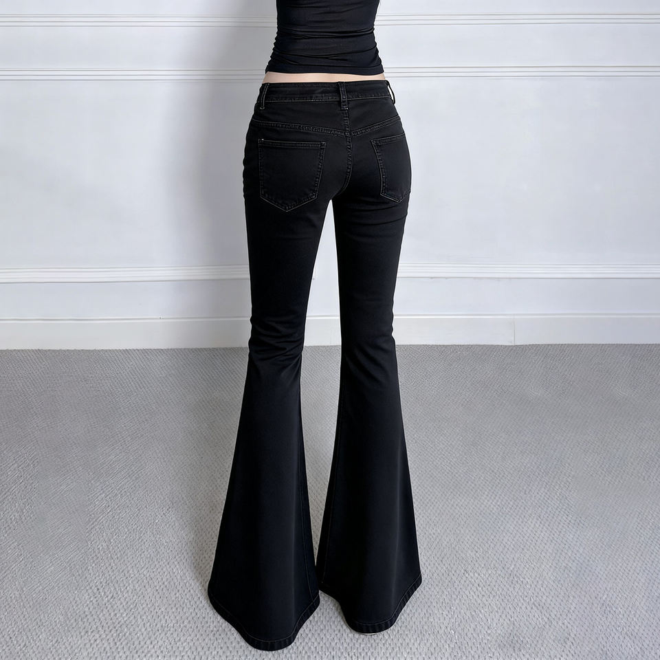 กางเกงยีนส์วินเทจสีดำเอวกลางทรงบาน แต่งแผ่นผ้าระบายอากาศ มีซิปและกระเป๋า เหมาะสำหรับใส่เดินทางและลำลอง เป็นมิตรกับสิ่งแวดล้อม
