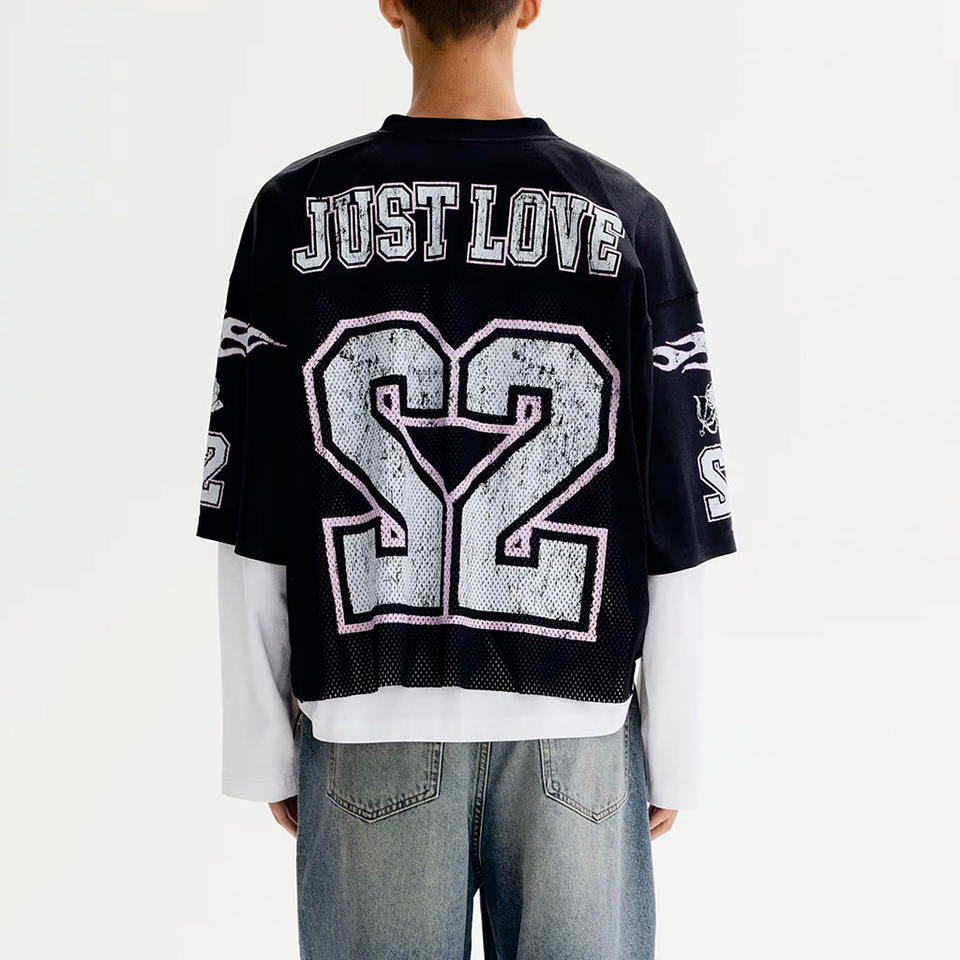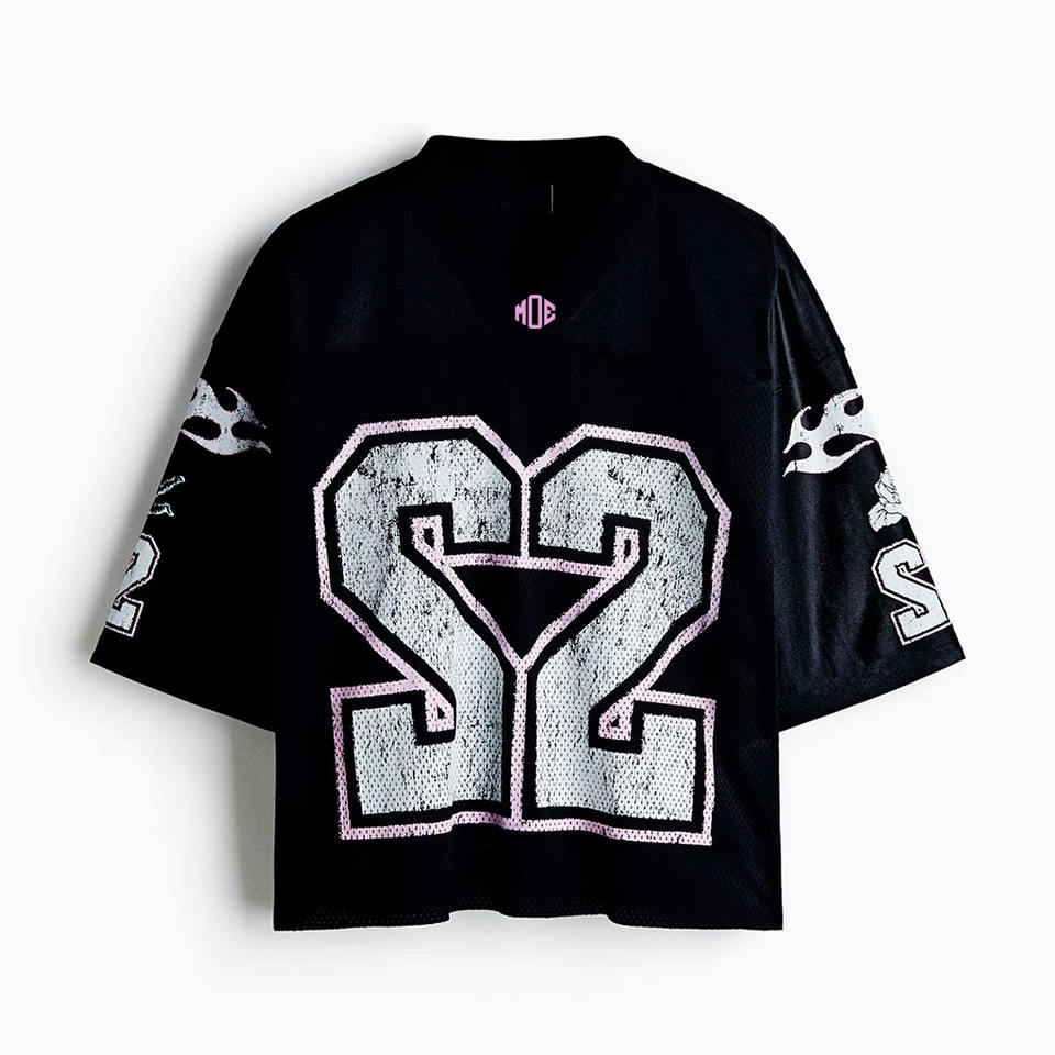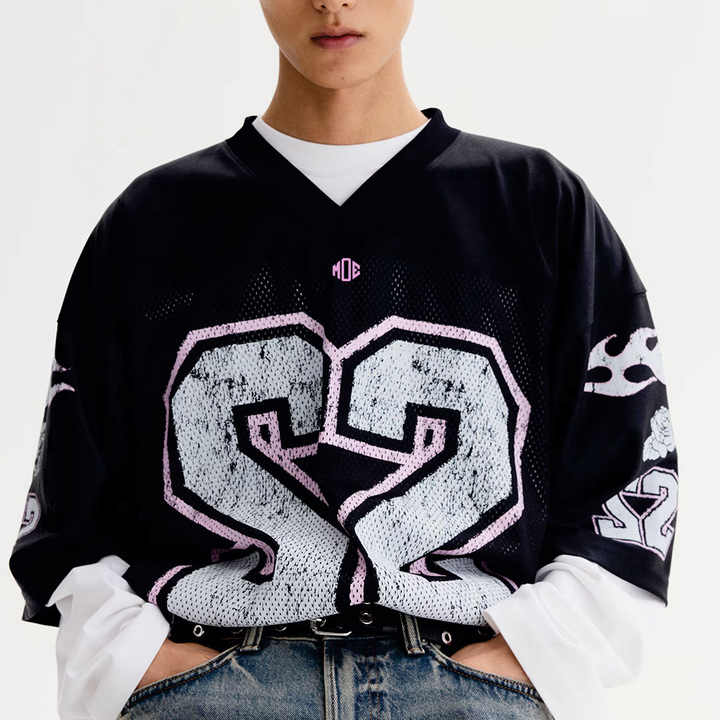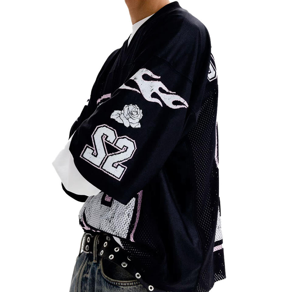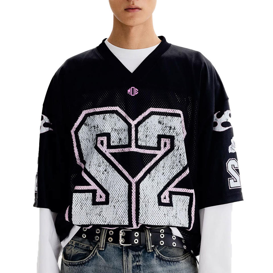 เสื้อเจอร์ซีย์อเมริกันฟุตบอลตาข่ายสีดำแบบสั่งทำพิเศษ ไซส์ใหญ่ พิมพ์หมายเลขสีชมพูขาว เสื้อผ้าสตรีทแวร์ ขายส่ง เสื้อกีฬา ผู้จำหน่าย