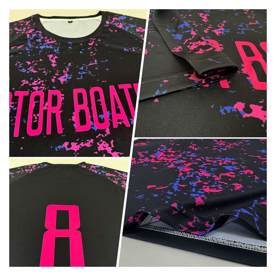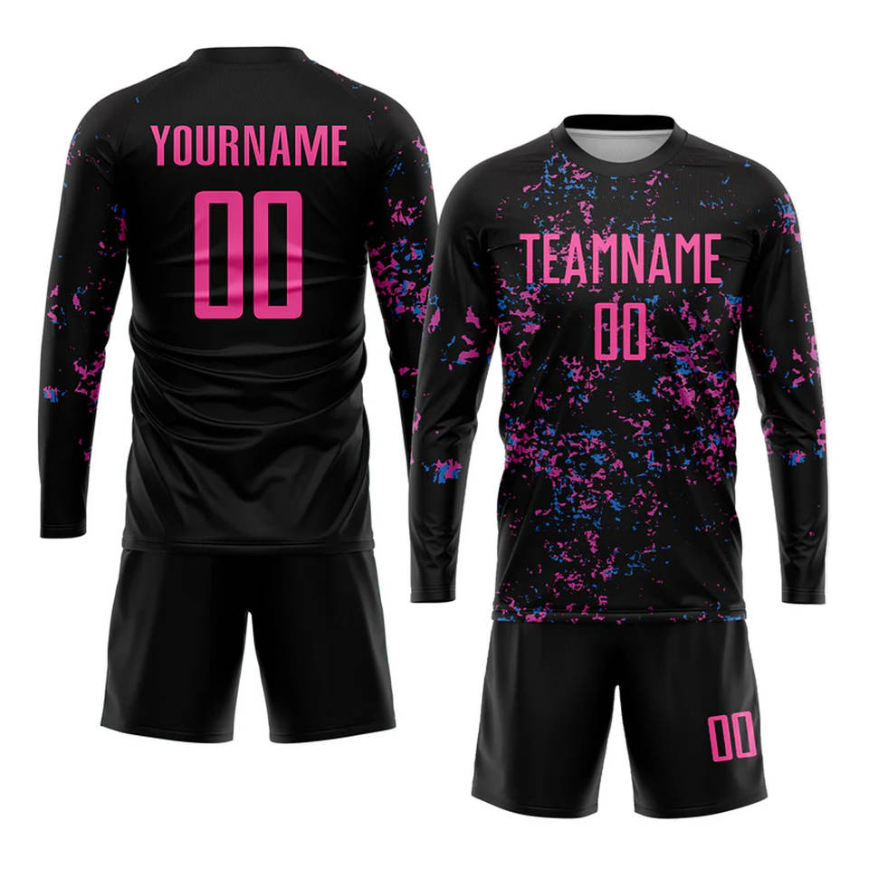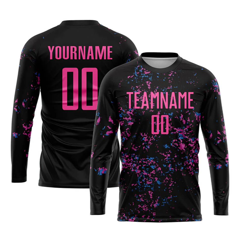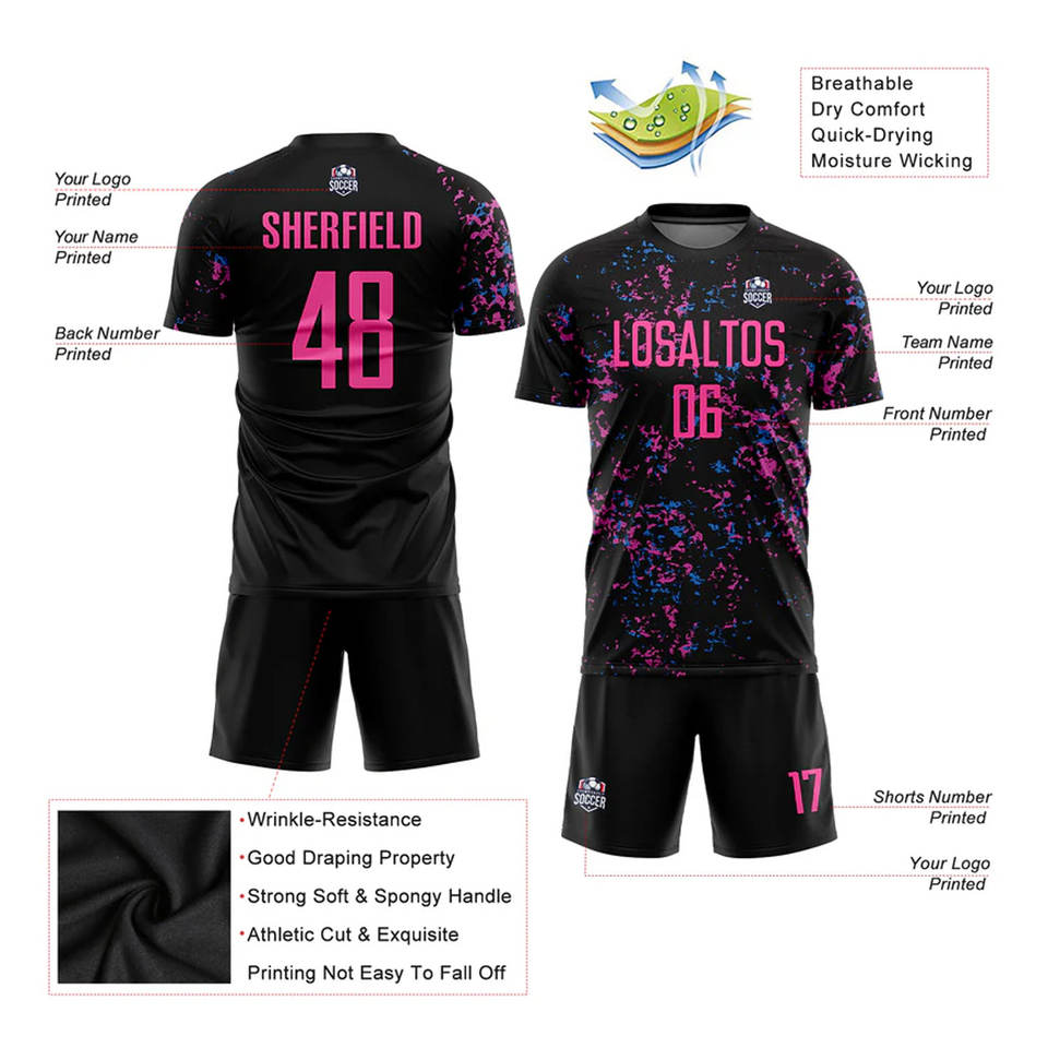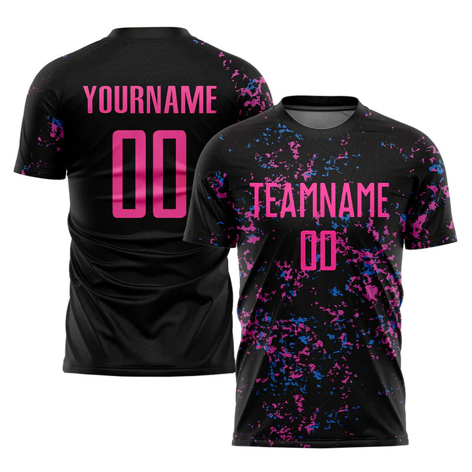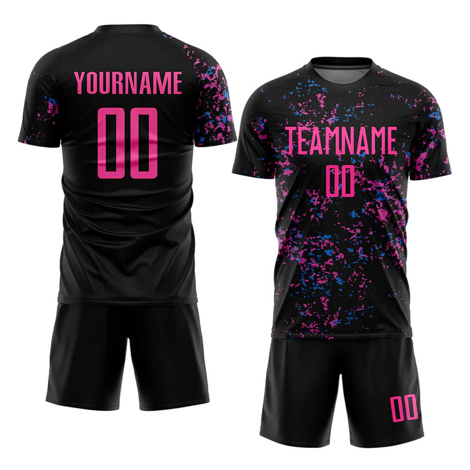 ชุดฟุตบอลแบบซับลิเมชั่นสีดำชมพูฟ้าอ่อน แบบกำหนดเองได้ ชุดกีฬาฟุตบอลระบายอากาศได้ดี สำหรับทีม