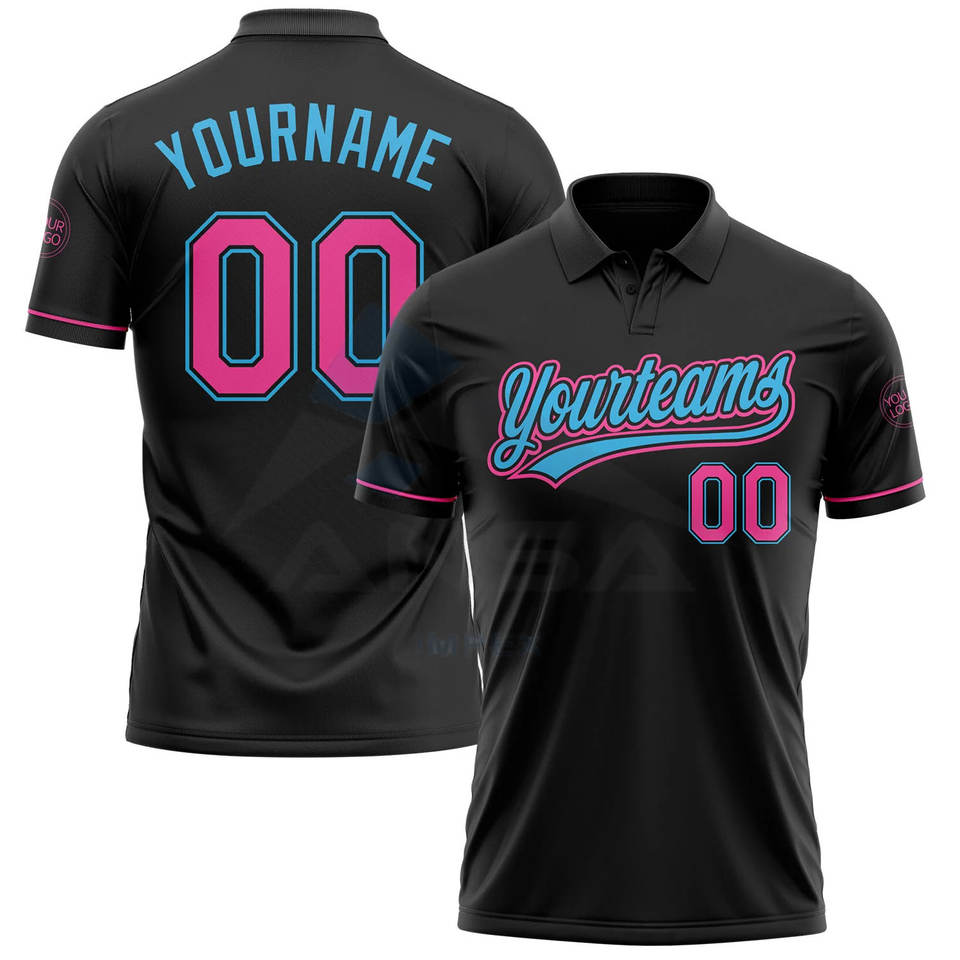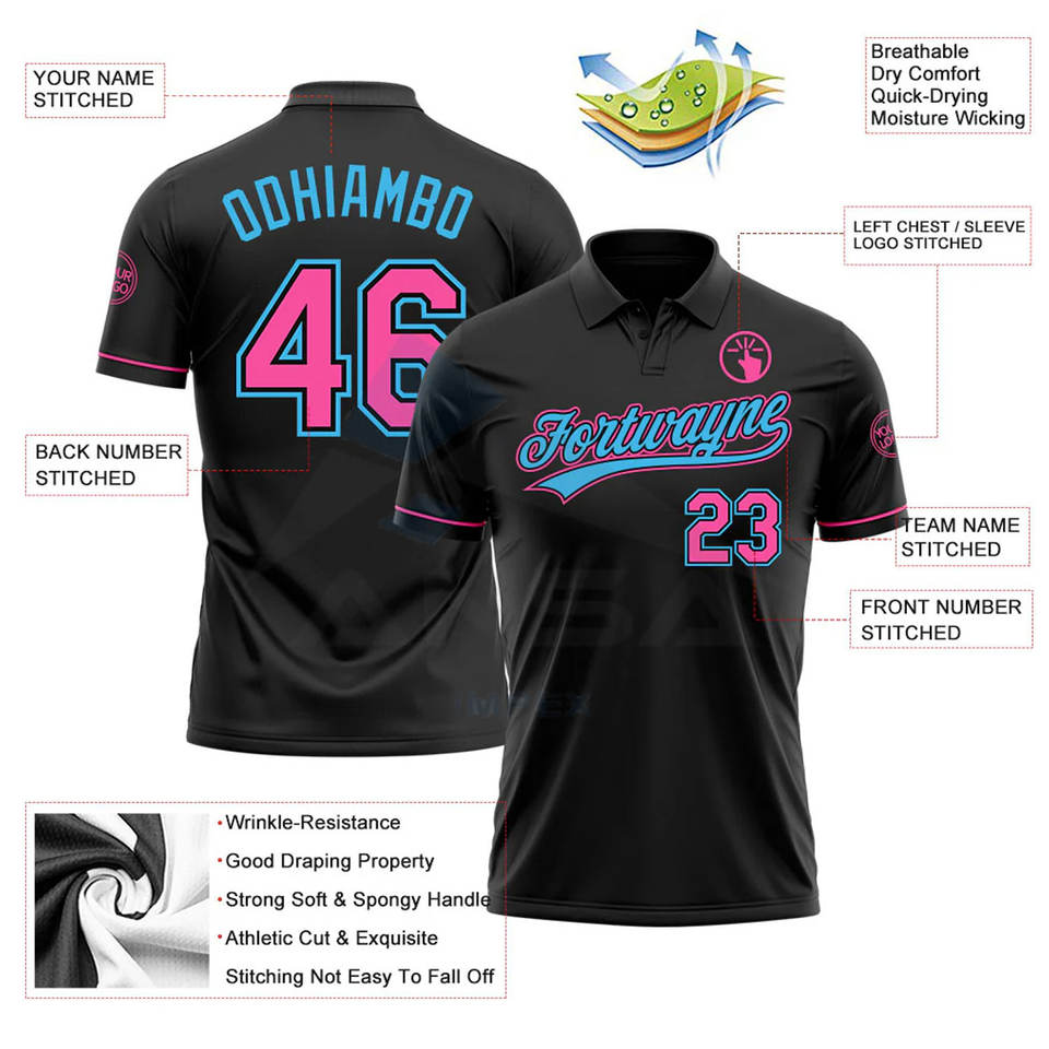 เสื้อโปโลกอล์ฟสีดำชมพูฟ้าแบบกำหนดเอง ระบายอากาศได้ดี ซับเหงื่อ เหมาะสำหรับกีฬากอล์ฟ