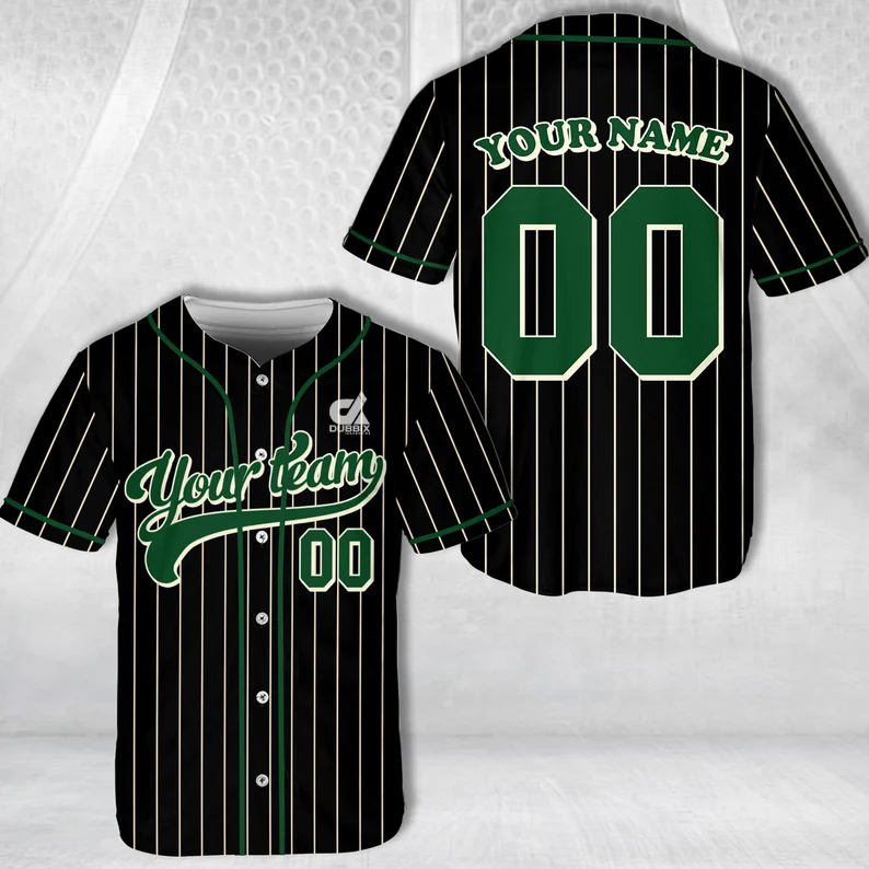 เสื้อเบสบอลลายเส้นสีดำแบบกำหนดเอง แต่งขอบสีเขียว ปิดด้วยกระดุม พร้อมปักชื่อและหมายเลขแบบมืออาชีพ ชุดทีม-ขายส่ง
