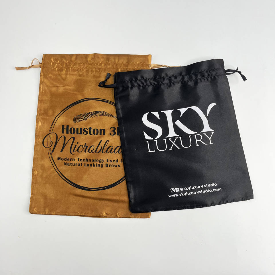 ถุงผ้าซาตินสีดำแบบมีเชือกผูกพร้อมพิมพ์สีขาว - บรรจุภัณฑ์หรูหราสำหรับแบรนด์ความงามและเสื้อผ้า
