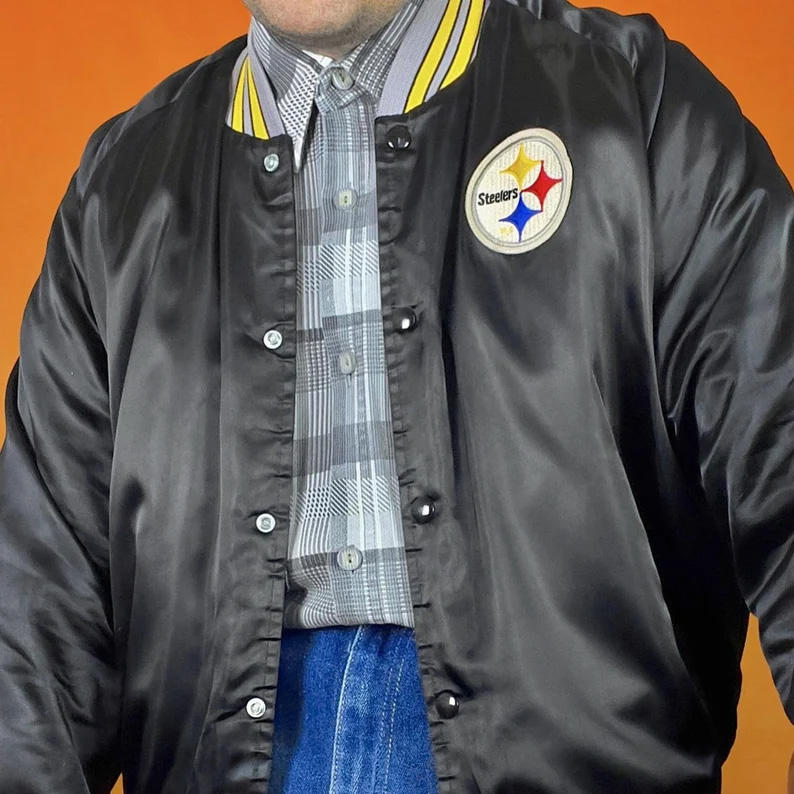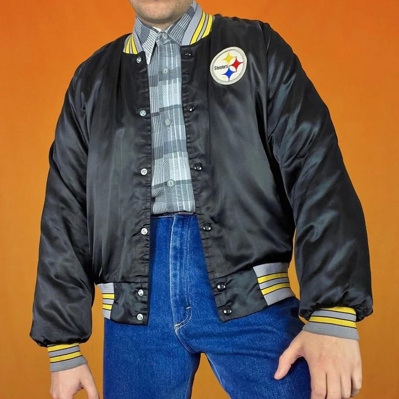 แจ็คเก็ตวาร์ซิตี้ผ้าซาตินสีดำแบบกำหนดเองสำหรับผู้ชาย แจ็คเก็ตบอมเบอร์แต่งขอบสีเหลือง ขายส่งชุดเบสบอลแบบ Letterman เสื้อผ้ากีฬา