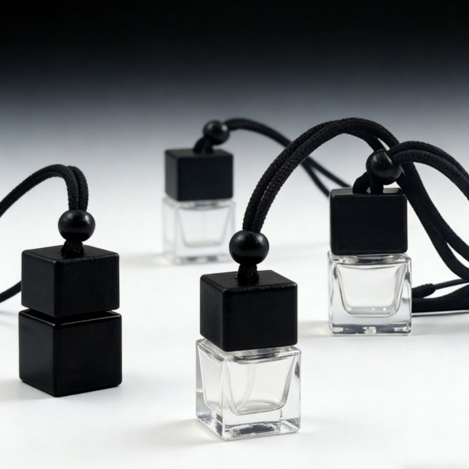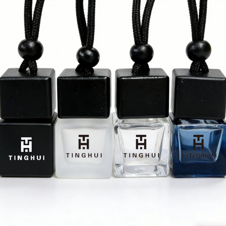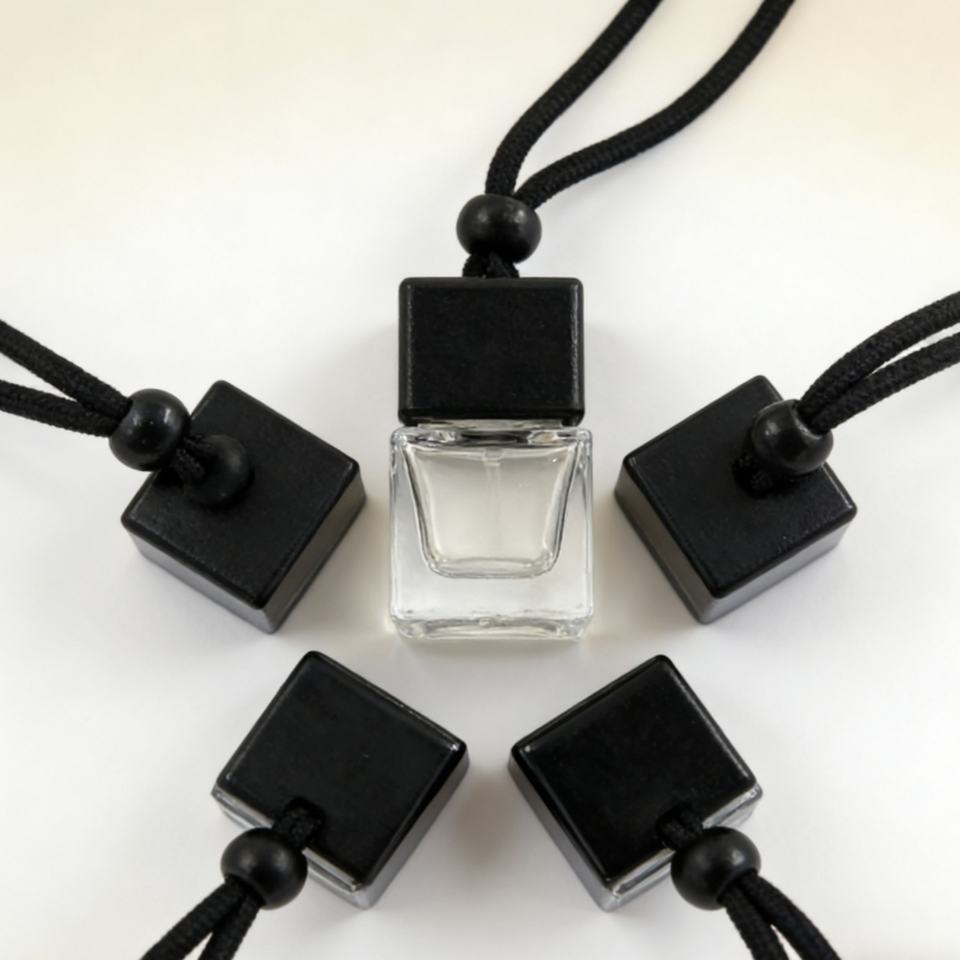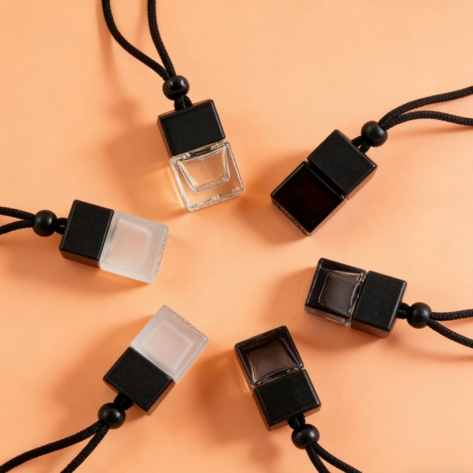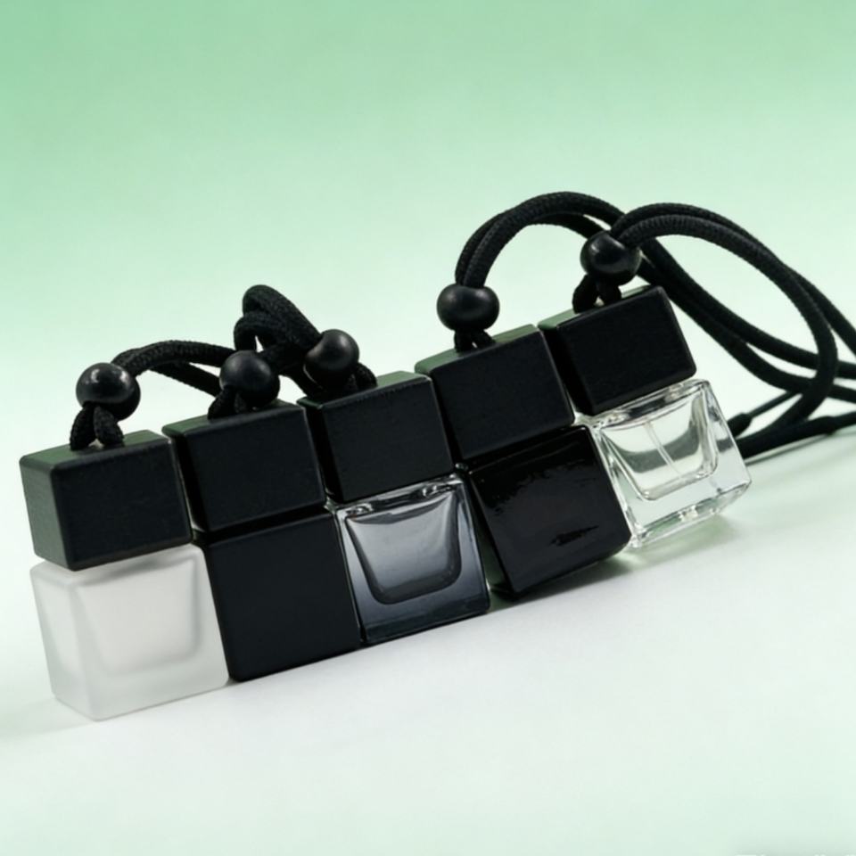 ขวดน้ำหอมรถยนต์แบบใสฝ้าขนาด 8 มล. ฝาเกลียวสีดำแบบกำหนดเอง พร้อมฝาเกลียวแบบแขวน พิมพ์สกรีนและปั๊มร้อน
