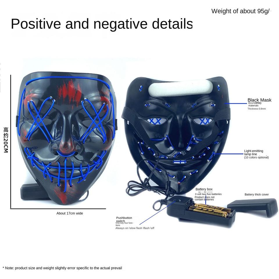 หน้ากากเรืองแสงฮาโลวีนแบบมีไฟเย็นทำจากพลาสติกสำหรับงานปาร์ตี้ไฟ LED สยองขวัญทรง V สีดำกำหนดได้เอง