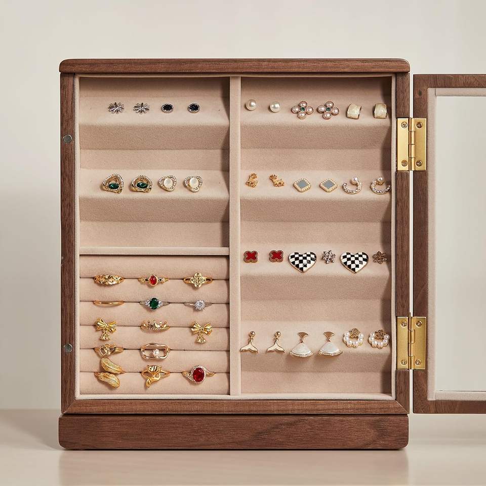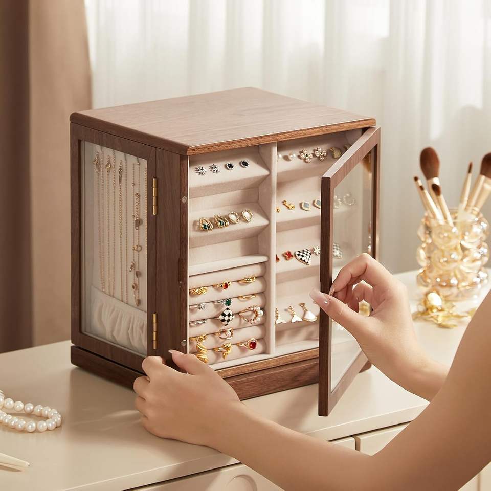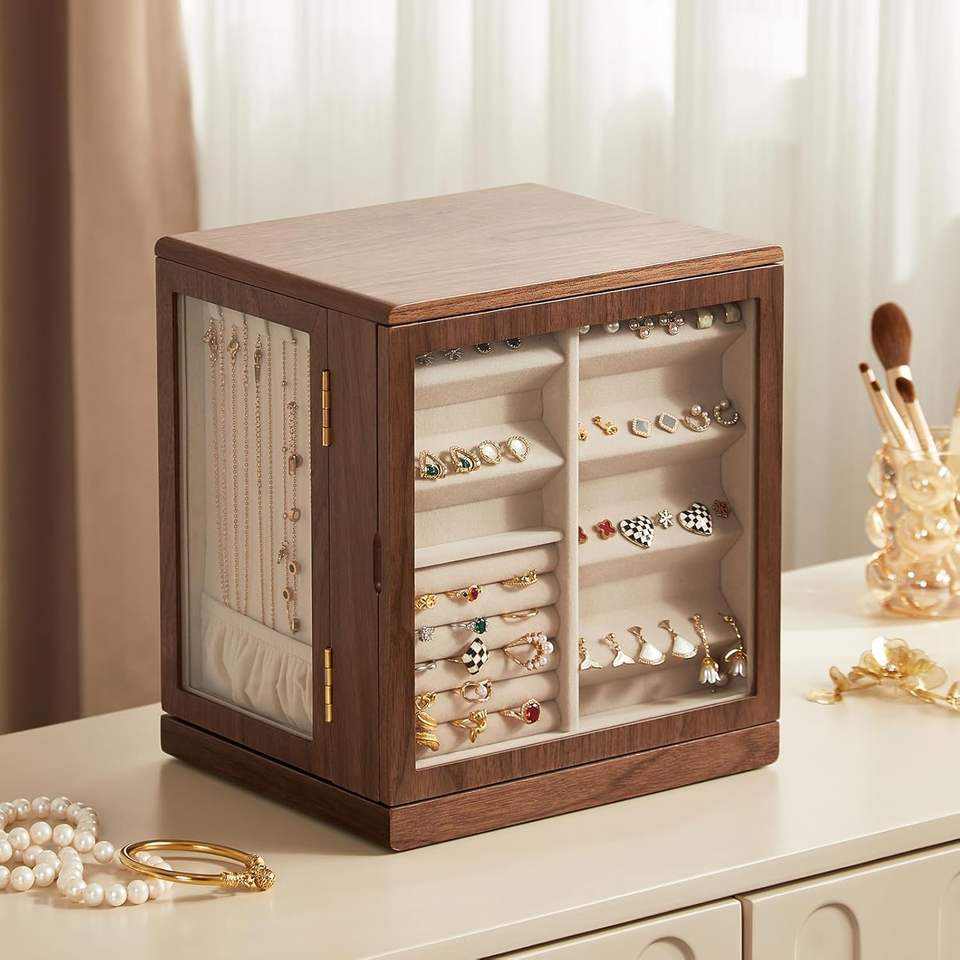 กล่องใส่เครื่องประดับไม้วอลนัทสีดำแบบกำหนดเอง สำหรับต่างหู แหวน สร้อยคอ กล่องเก็บเครื่องประดับแนวตั้งสำหรับผู้หญิง ของขวัญคริสต์มาส