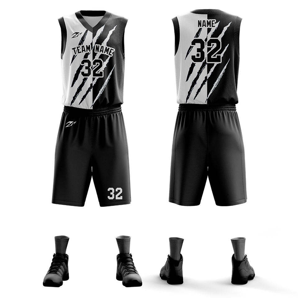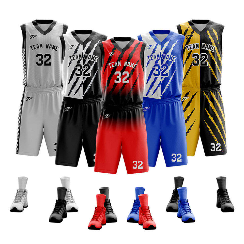 ชุดบาสเก็ตบอลสีดำ ขาว แดง และน้ำเงินแบบกำหนดเอง ปี 2026 เสื้อเจอร์ซีย์ ปี 2025 ชุดทีมแบบซับลิเมชั่นเต็มตัว ชุดกีฬาอาชีพ ความคมชัดสูง