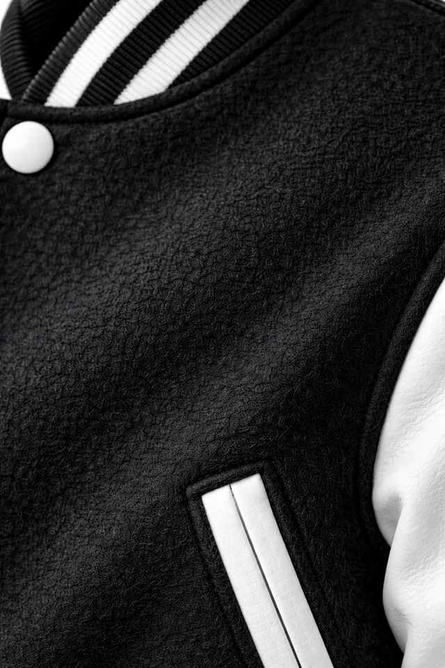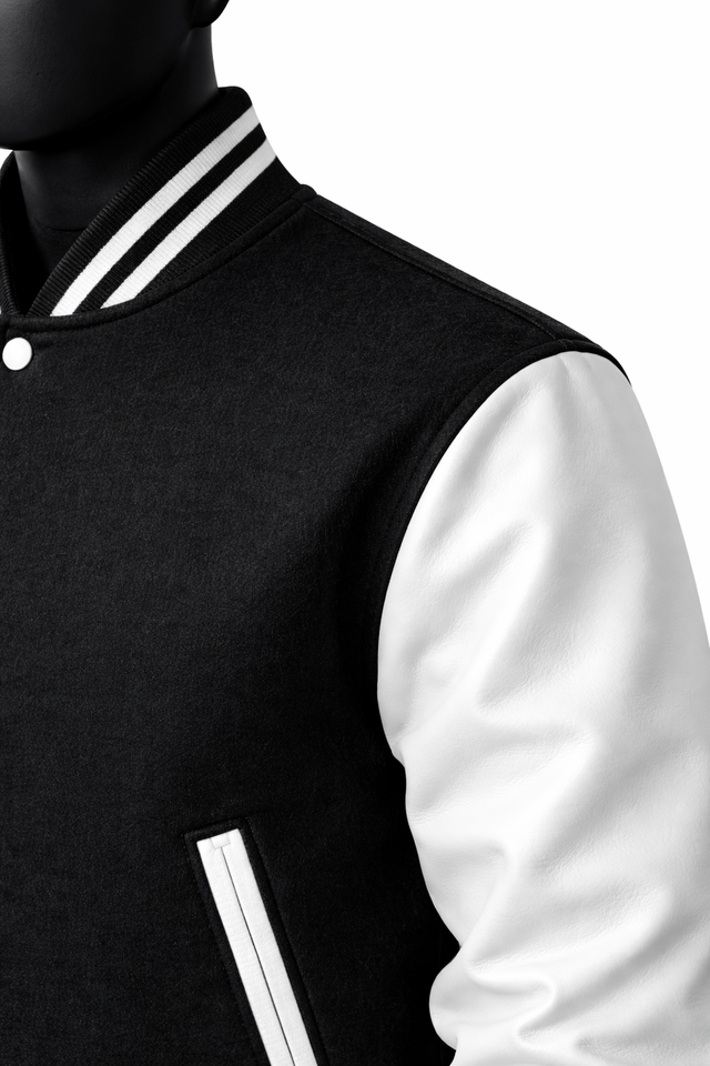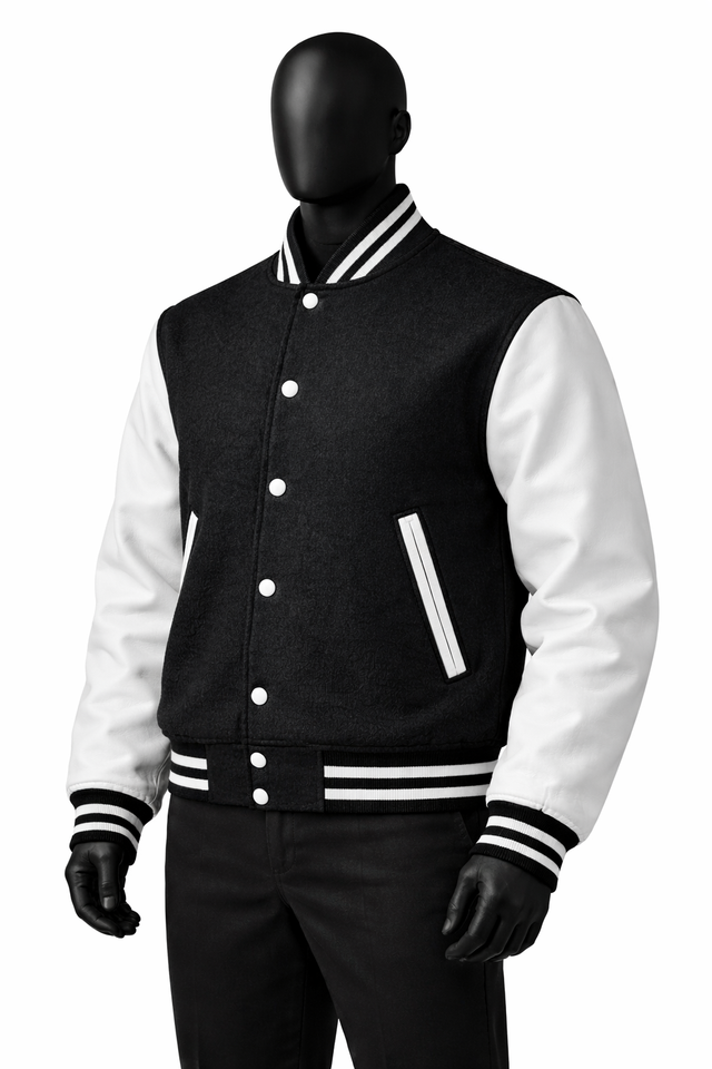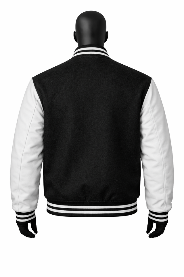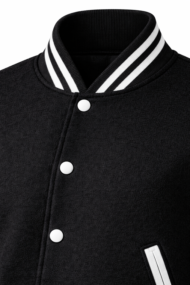แจ็คเก็ตวาร์ซิตี้สีดำขาวแบบกำหนดเอง แจ็คเก็ตเลตเตอร์แมนผ้าขนสัตว์ผสม แจ็คเก็ตเบสบอลติดกระดุมแบบสแนป รับผลิตแบบ OEM แบรนด์ส่วนตัว ขายส่ง