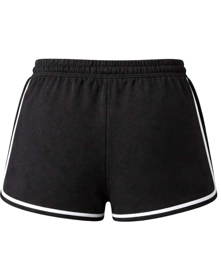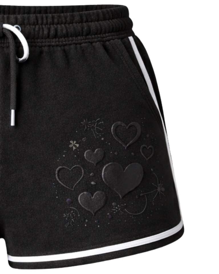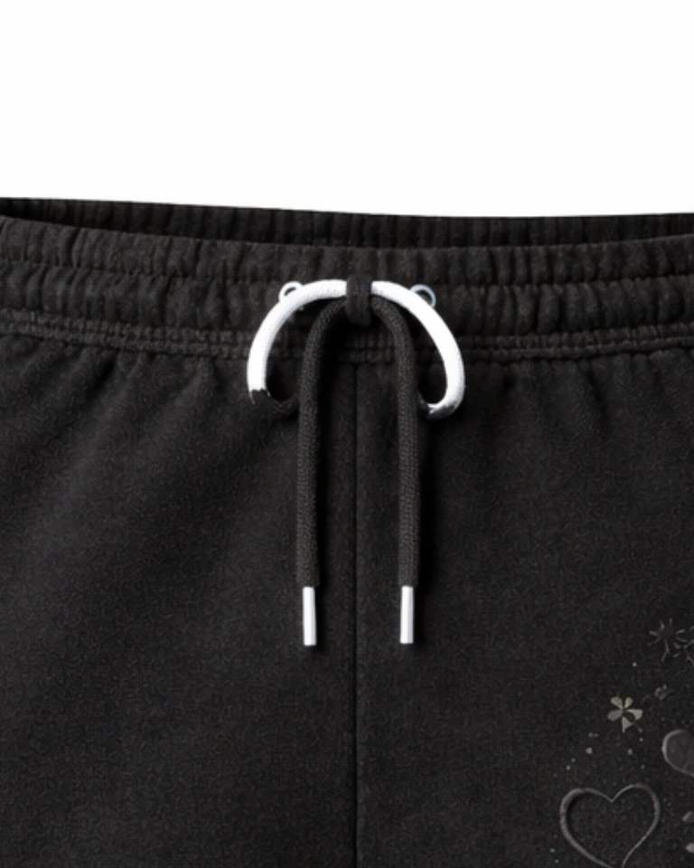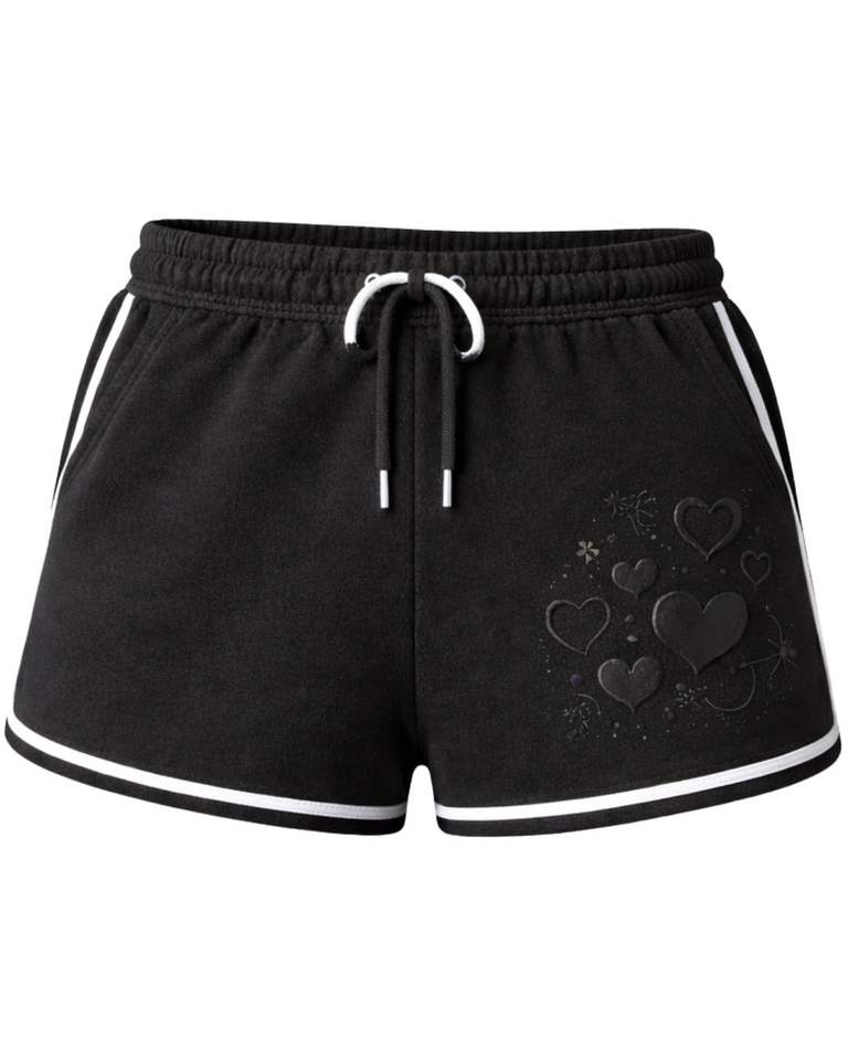 กางเกงขาสั้นผ้าฟลีซพิมพ์ลายหัวใจผู้หญิงสีดำแบบกำหนดเอง พร้อมขอบยางยืดสีขาว ชุดลำลองฤดูร้อนสำหรับพักผ่อน ผู้ผลิตตามสั่ง OEM