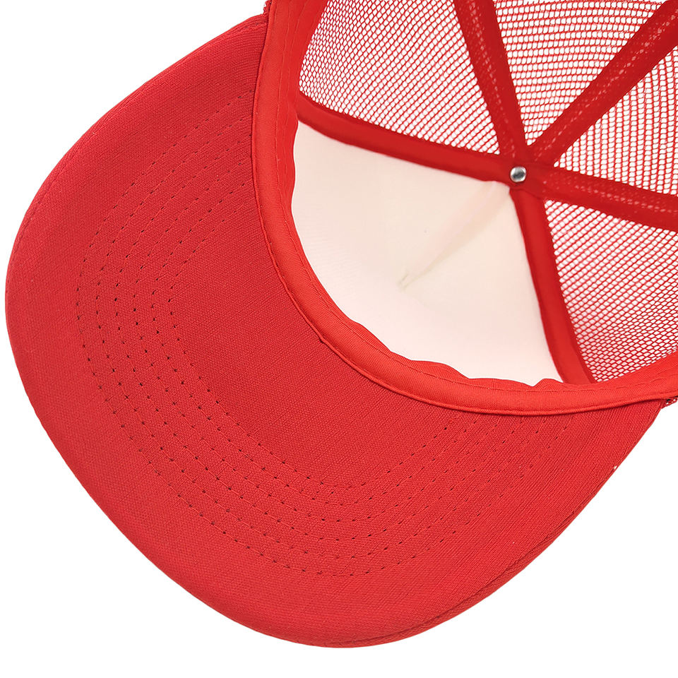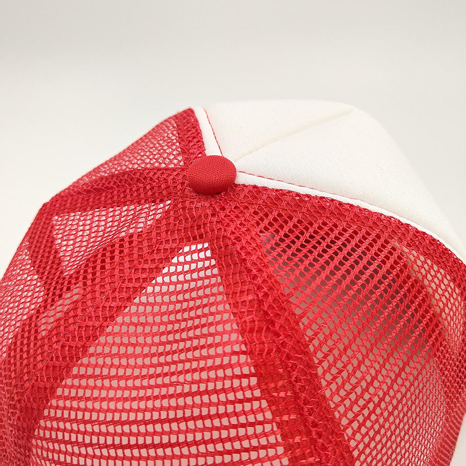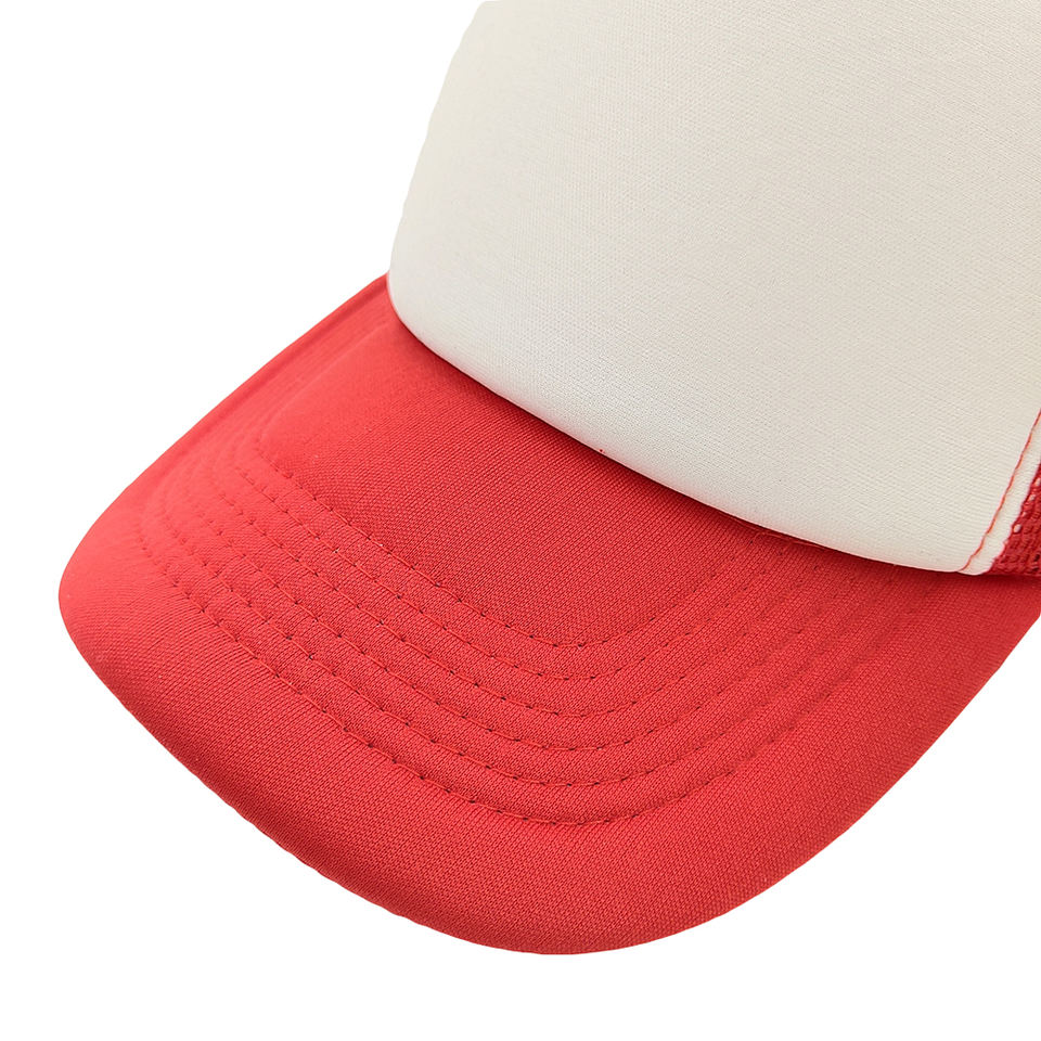 หมวกแก๊ปทรงทรัคเกอร์สีแดงขาวผ้าซาตินแบบกำหนดเอง คุณภาพสูง โฟม 6 แผง ปรับขนาดได้ ระบายอากาศได้ดี สวมใส่สบาย หมวกเบสบอลปักโลโก้ตามสั่ง