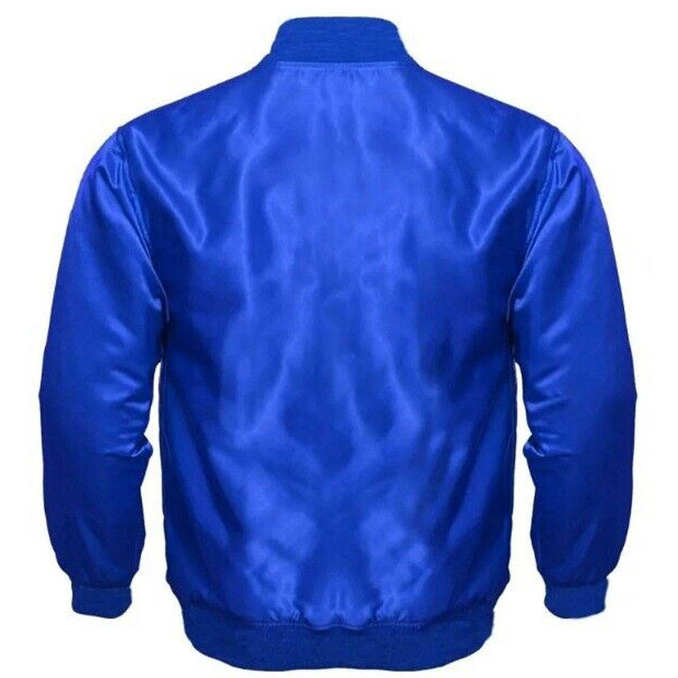 แจ็คเก็ตซาตินสีน้ำเงินแบบกำหนดเอง แจ็คเก็ตวาร์ซิตี้ซาตินคุณภาพสูงสำหรับผู้ชาย มีกระเป๋าข้าง