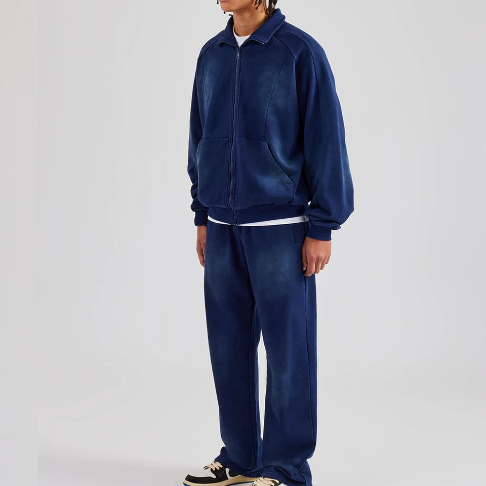 Custom Blanks Heavyweight Puff Print Zip up Hoodie and Flared Sweatpants Jogger Set 100% Cotton Acid Wash Tracksuits for Men
