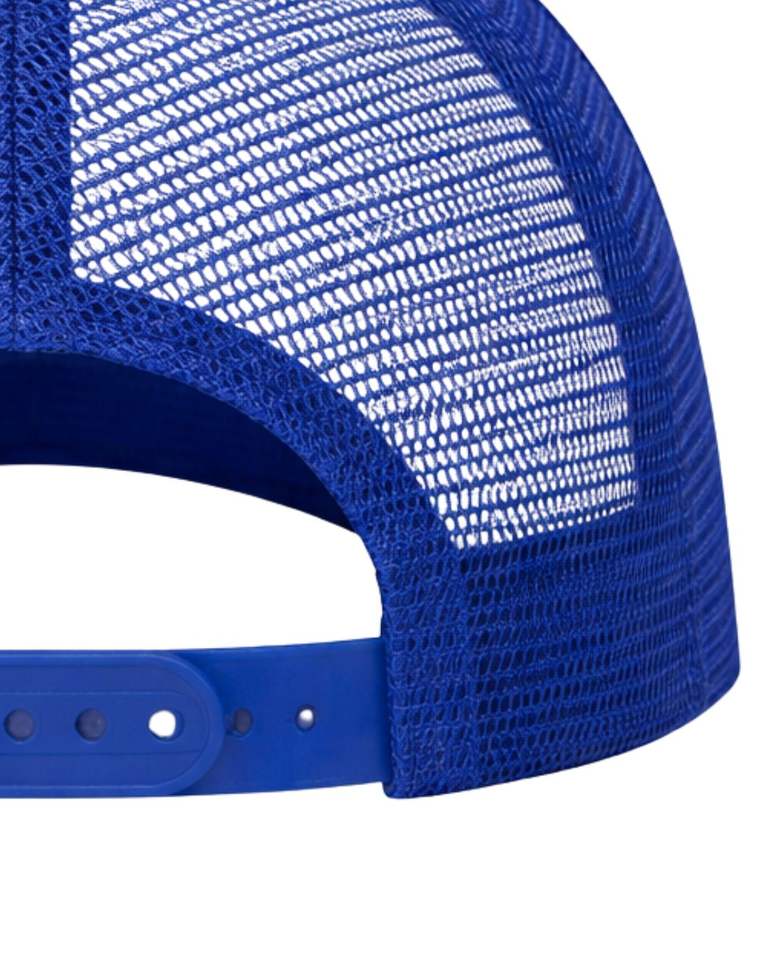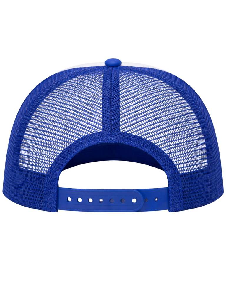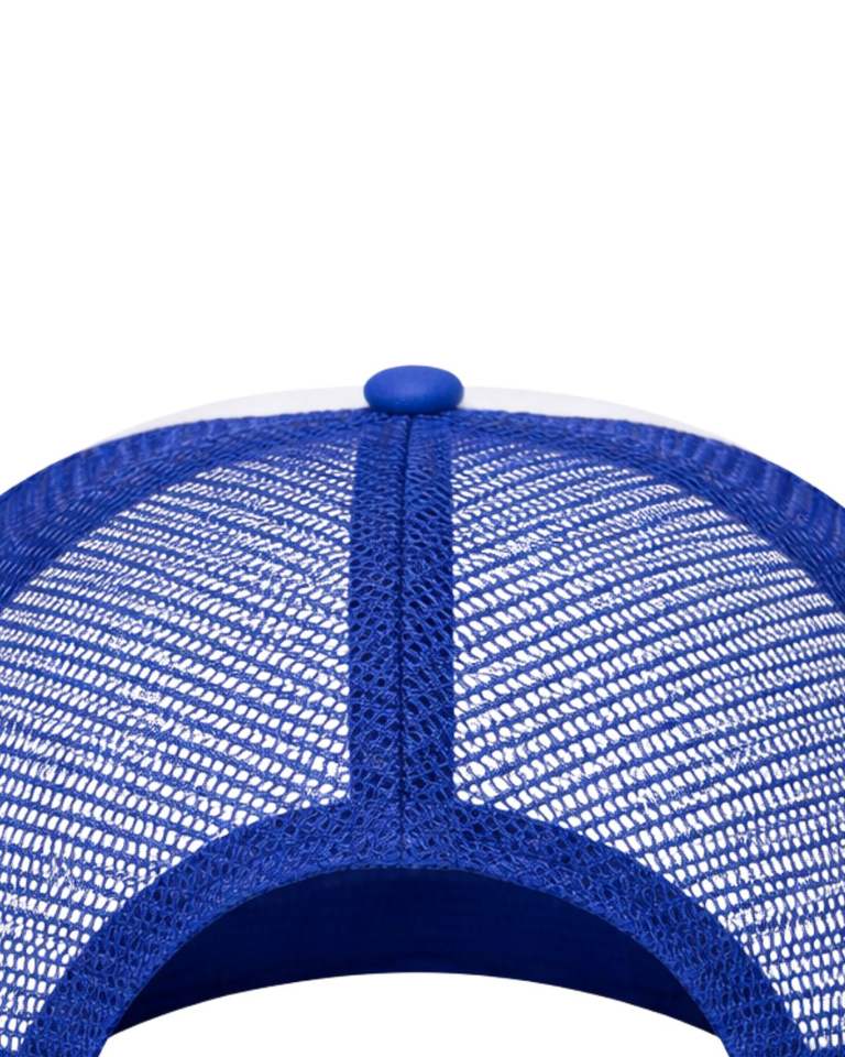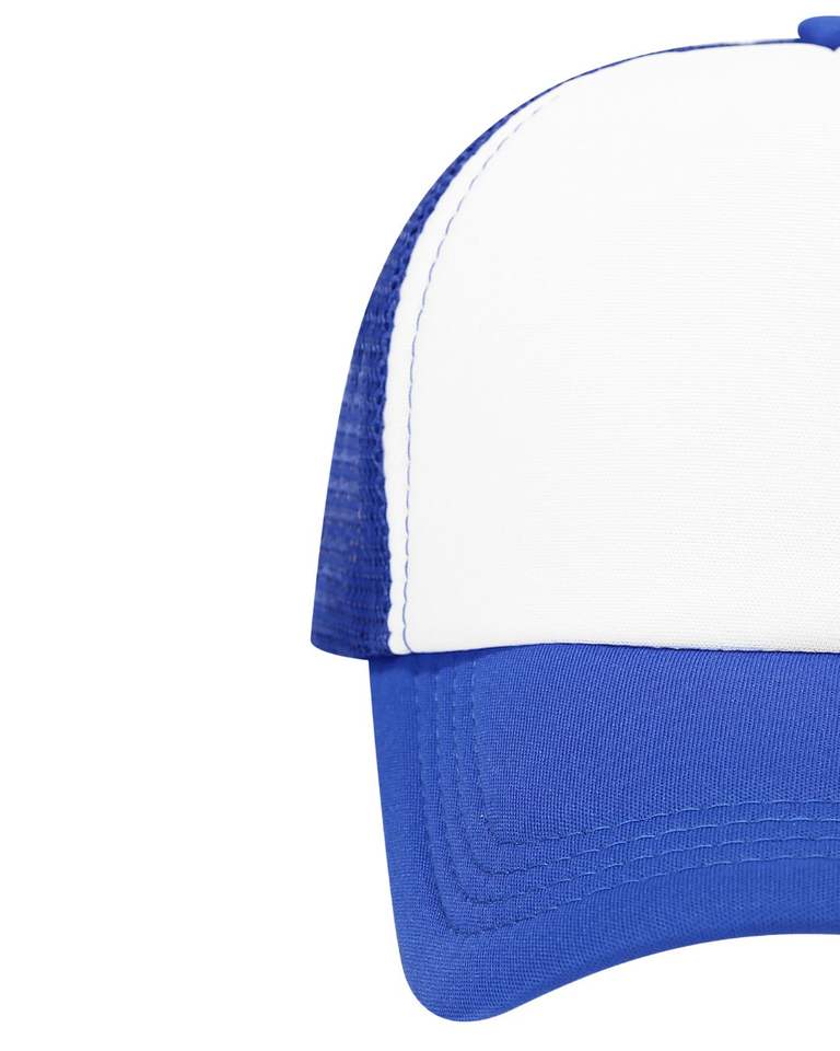 หมวกแก๊ปทรงทรัคเกอร์สีน้ำเงินขาวแบบกำหนดเอง ปรับขนาดได้ ระบายอากาศได้ดี หมวกเบสบอลตาข่าย ปักโลโก้ได้ หมวกสแนปแบ็ค โพลีเอสเตอร์เรียบๆ สำหรับเล่นกีฬา