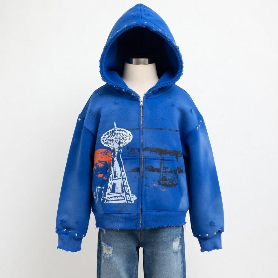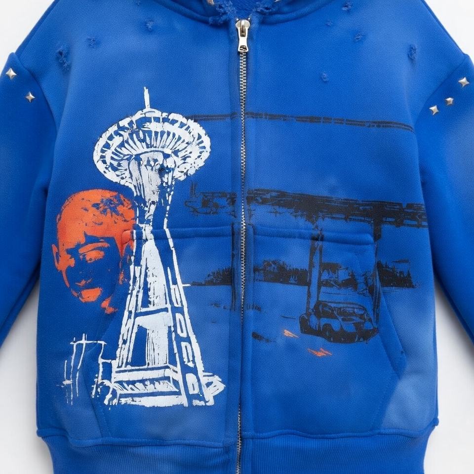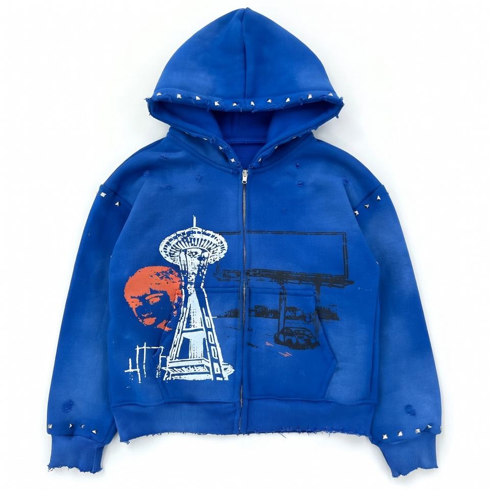 เสื้อฮู้ดซิปสีน้ำเงินลายกราฟิกแบบกำหนดเองสำหรับผู้ชาย แต่งกระดุม แต่งขาดสไตล์สตรีทแวร์ ผ้าคอตตอนหนานุ่ม ทรงโอเวอร์ไซส์ ซักล้างแล้ว สไตล์ Y2K