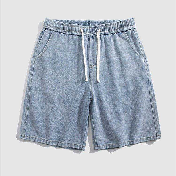 กางเกงขาสั้นผ้าเดนิมเอวสูงสำหรับผู้ชายกางเกงขาสั้นผ้าเดนิมระบายอากาศกันน้ำทรงหลวมสีน้ำเงินออกแบบโลโก้ได้ตามต้องการ