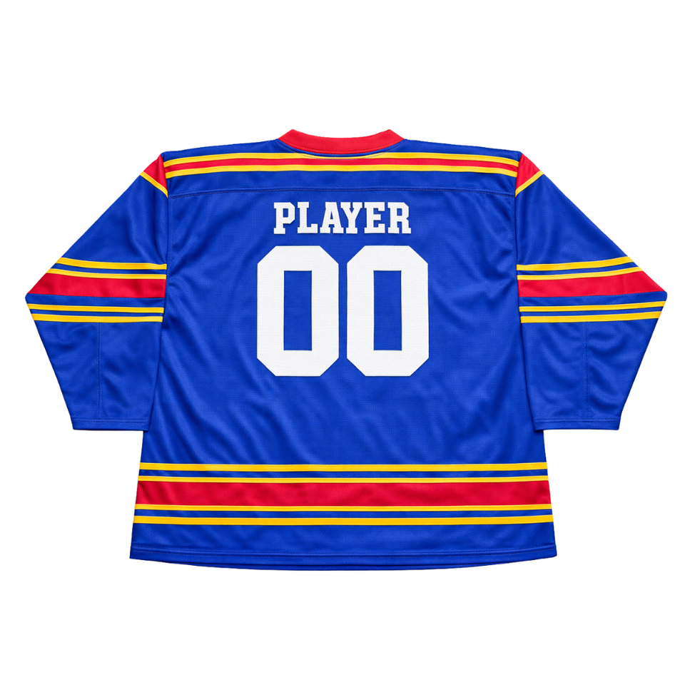 เสื้อฮอกกี้น้ำแข็งแบบซับลิเมชั่นสีน้ำเงินแดงสั่งทำพิเศษ ชื่อทีม ชุดฮอกกี้ระดับโปร เสื้อฮอกกี้สำหรับผู้ชาย ระบายอากาศได้ดี