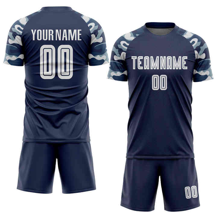 ชุดยูนิฟอร์มฟุตบอลสีน้ำเงินแบบกำหนดเอง แขนเสื้อลายพราง ผ้าโพลีเอสเตอร์ กางเกงขาสั้น แห้งเร็ว ระบายอากาศได้ดี ชุดทีม OEM ชุดฝึกซ้อมระบายอากาศได้ดี