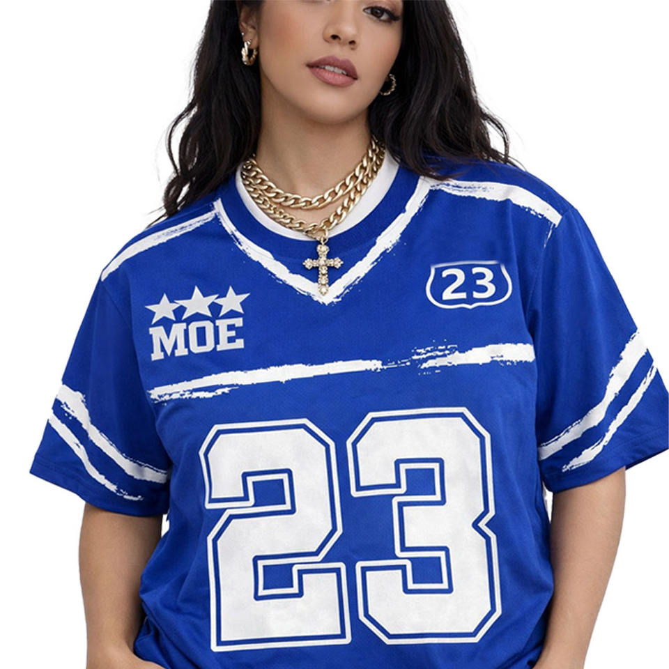เสื้อเจอร์ซีย์กีฬาคอวีสีน้ำเงินแบบกำหนดเองสำหรับผู้หญิง เสื้อยืดโอเวอร์ไซส์สไตล์สตรีทแวร์ พิมพ์ลายหมายเลข ขายส่ง เสื้อเจอร์ซีย์อเมริกันฟุตบอลจากซัพพลายเออร์