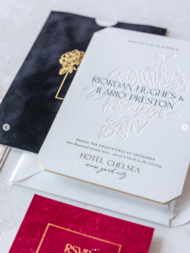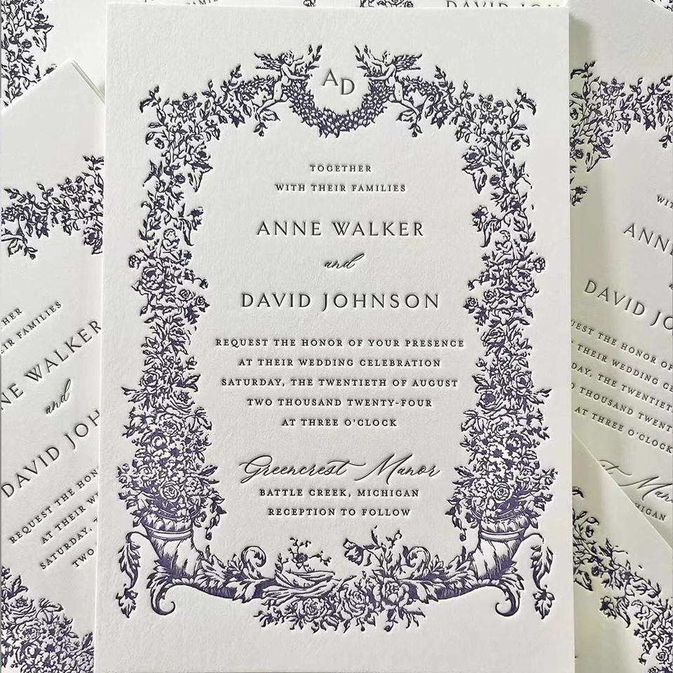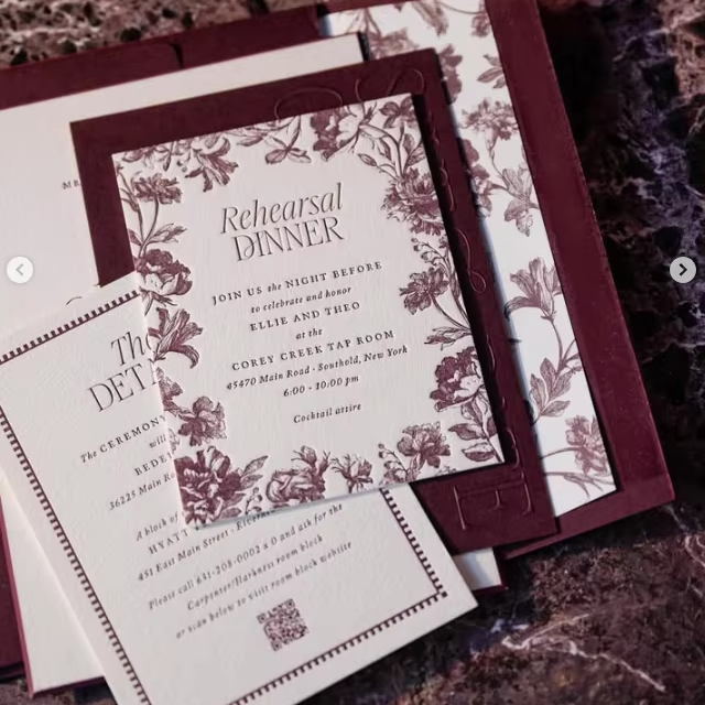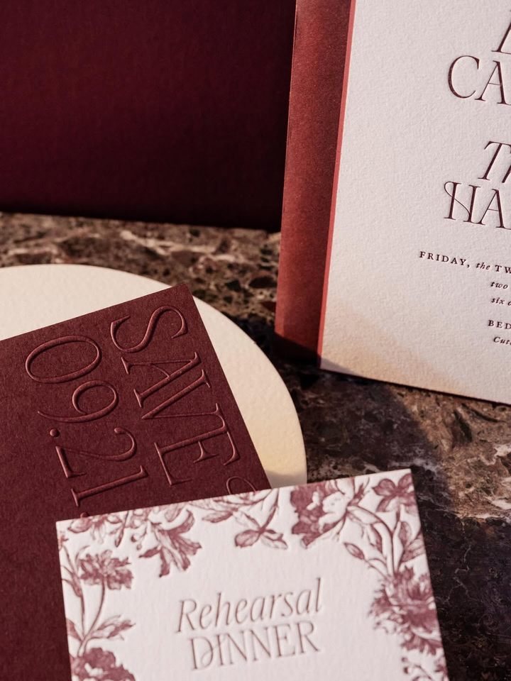 การ์ดเชิญงานแต่งงานแบบพิมพ์นูนลายบอร์โดซ์บนกระดาษฝ้ายเนื้อสัมผัสพิเศษ พร้อมขอบตัดเฉียงคมชัด