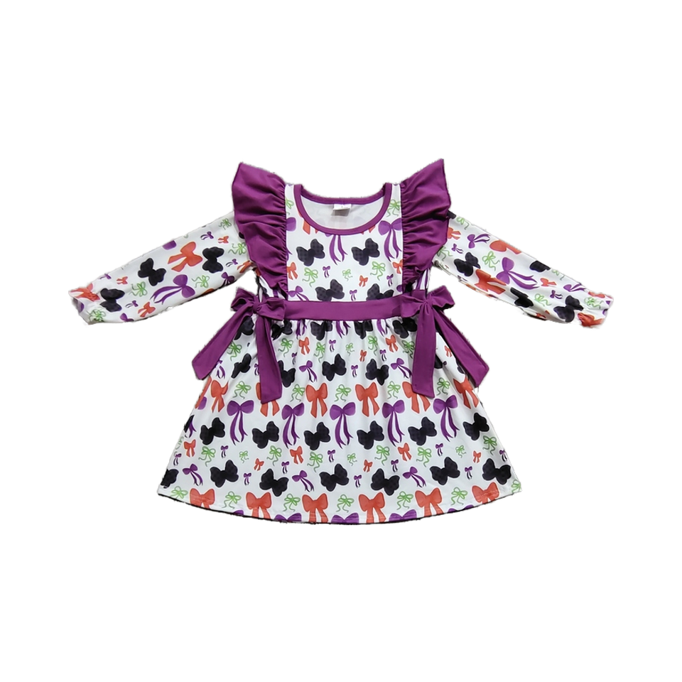 เดรสพิมพ์ลายบูติกตามสั่งสำหรับเด็กผู้หญิงตัวเล็กชุดเด็กผู้หญิงแขนยาวฤดูใบไม้ร่วงสีม่วงโบว์ดอกไม้ขายส่งฤดูร้อน