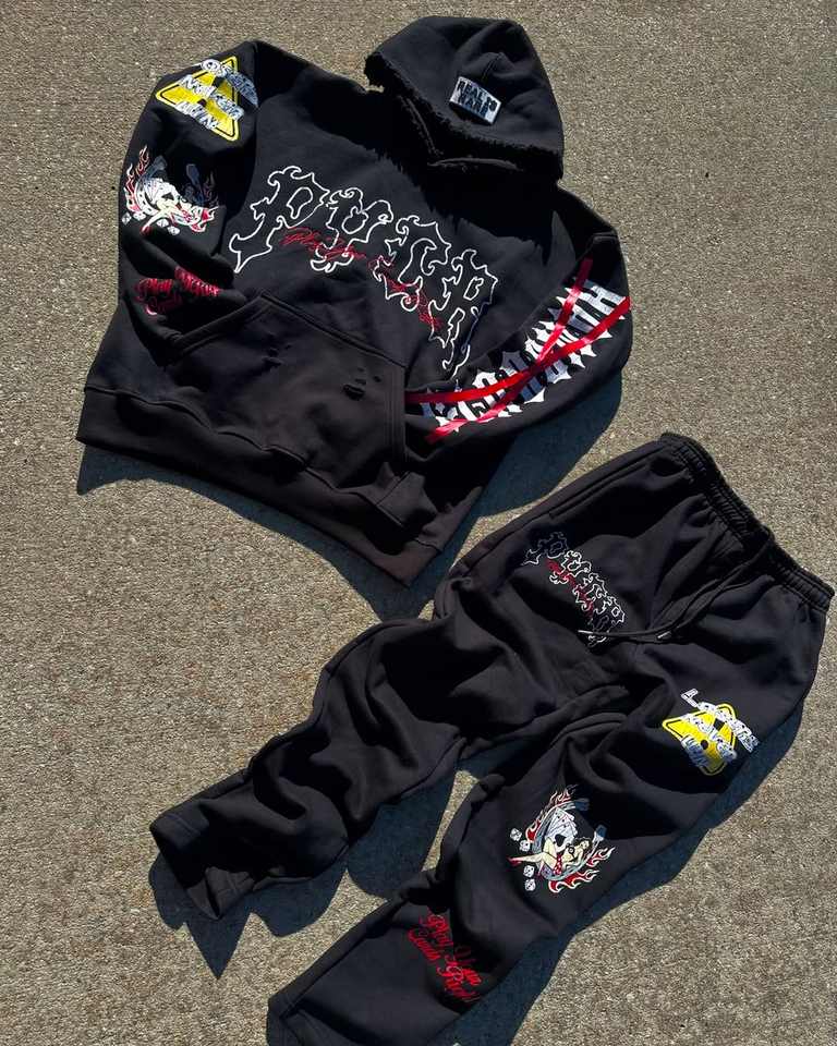 ชุดวอร์มผ้าฟลีซคอตตอน 100% ทรงบ็อกซี่ ย้อมสีแบบแอซิดวอช มีฮู้ด พร้อมเชือกผูก ปรินท์ลาย แห้งเร็ว สำหรับผู้ชาย