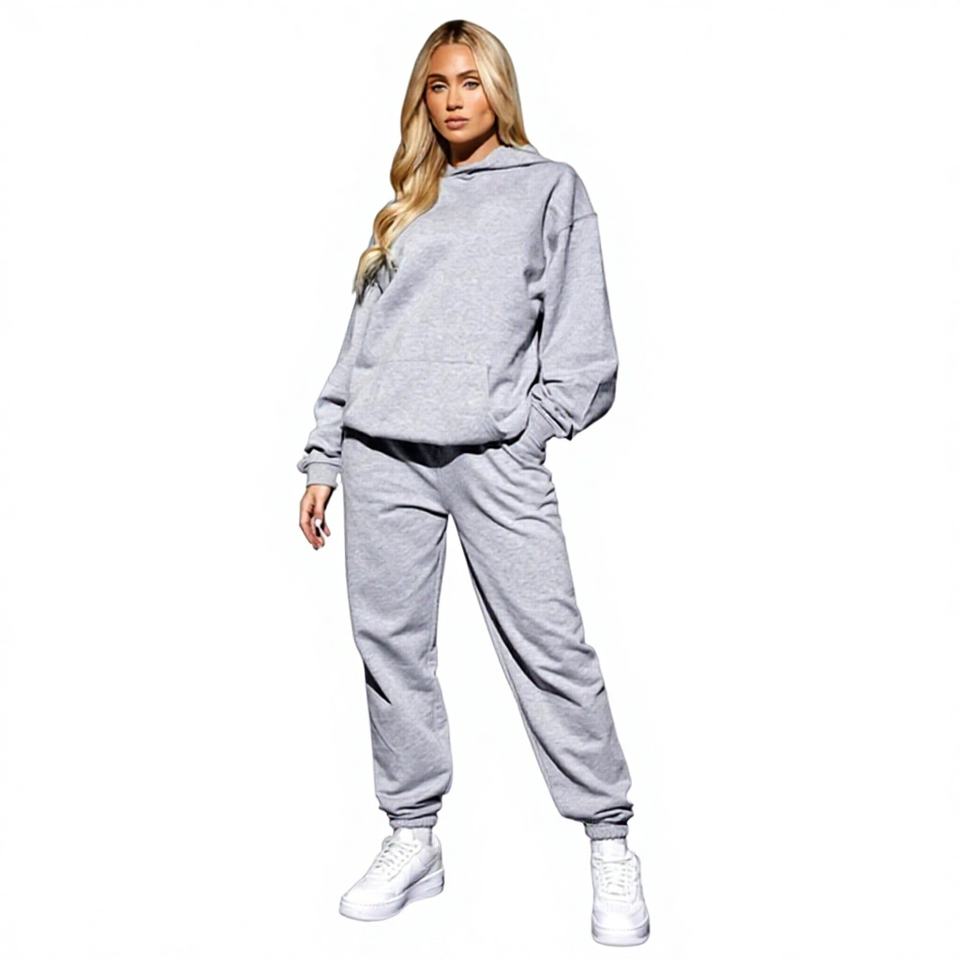ชุดวอร์มผู้หญิงปักโลโก้แบรนด์ตามสั่ง ผ้าฟลีซแบบมีฮู้ด 65% คอตตอน 35% โพลีเอสเตอร์ ทรงโอเวอร์ไซส์ สวมใส่สบาย สีเทาเฮเธอร์